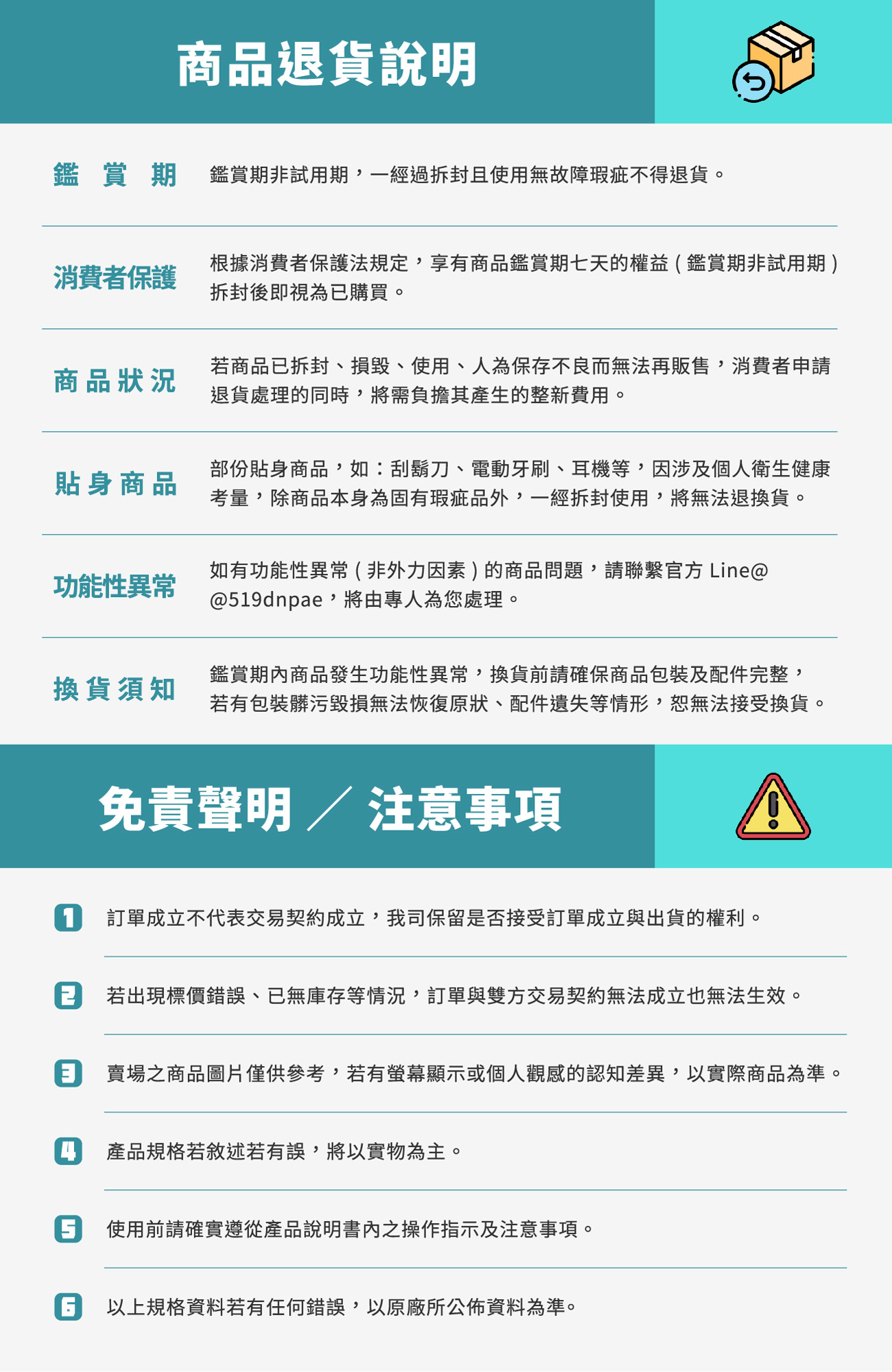 如果您所購買的商品是屬於易於腐敗之商品、保存期限較短之商品、客製化商品、報紙、期刊、雜誌,依據消費者保護法之規定,於收受商品後將無法享有七天猶豫期之權益且不得辦理退貨。