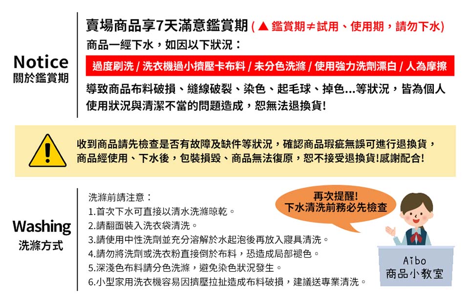 ◆注意事項:請於鑑賞期內確認商品之內容、尺寸、規格、數量,確定無誤再使用。退換貨請保持商品完整性,商品必須為『全新未經使用』,商品包裝需完整回收,包含購買商品、外盒、附件、內外包裝、隨機文件、贈品、商品外膜等請一併退回。個人衛生用品如經拆封使用、下水洗滌、拆解、髒汙、損毀、缺件及失去再販售價值之情況,視狀況接受退換貨。