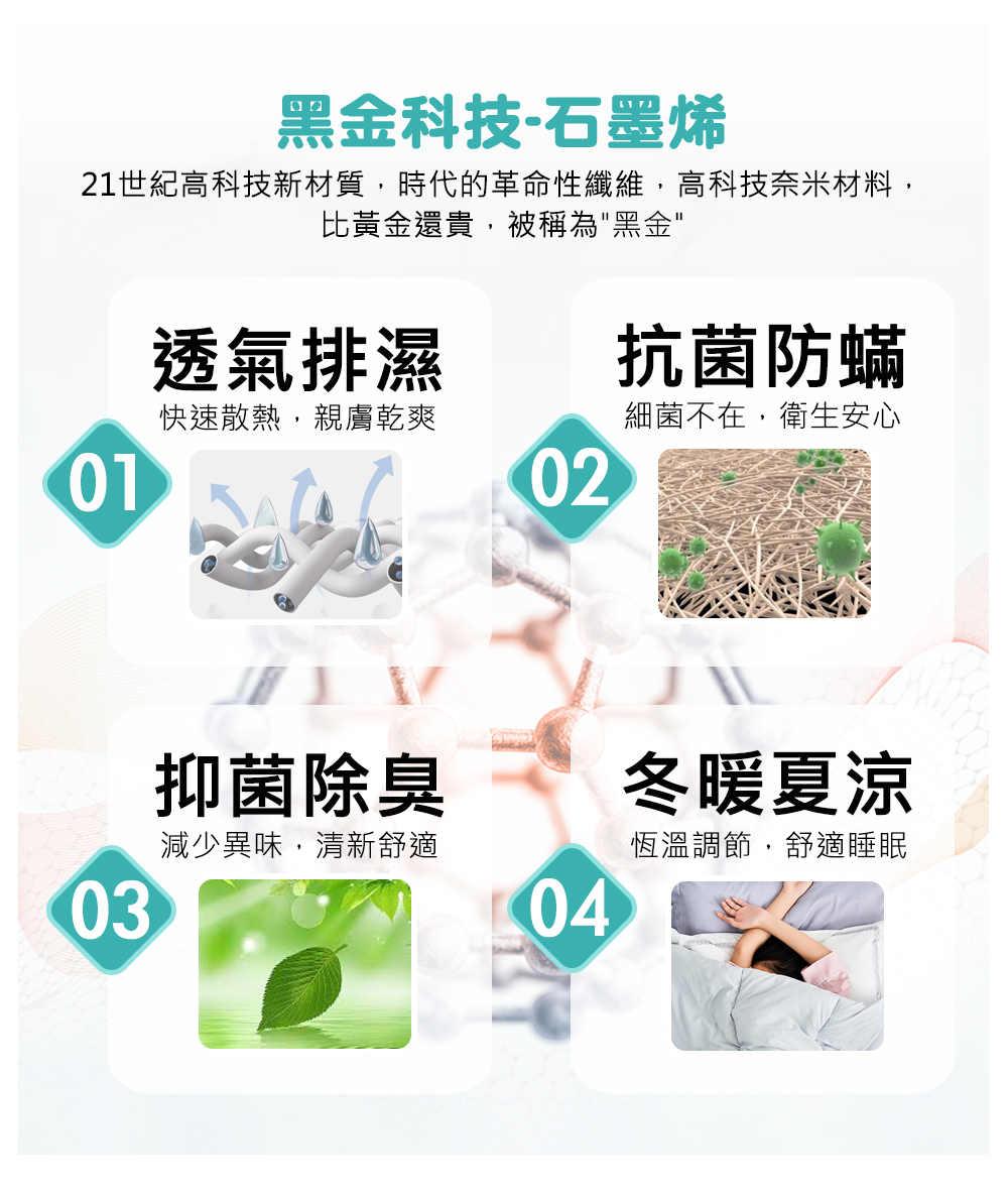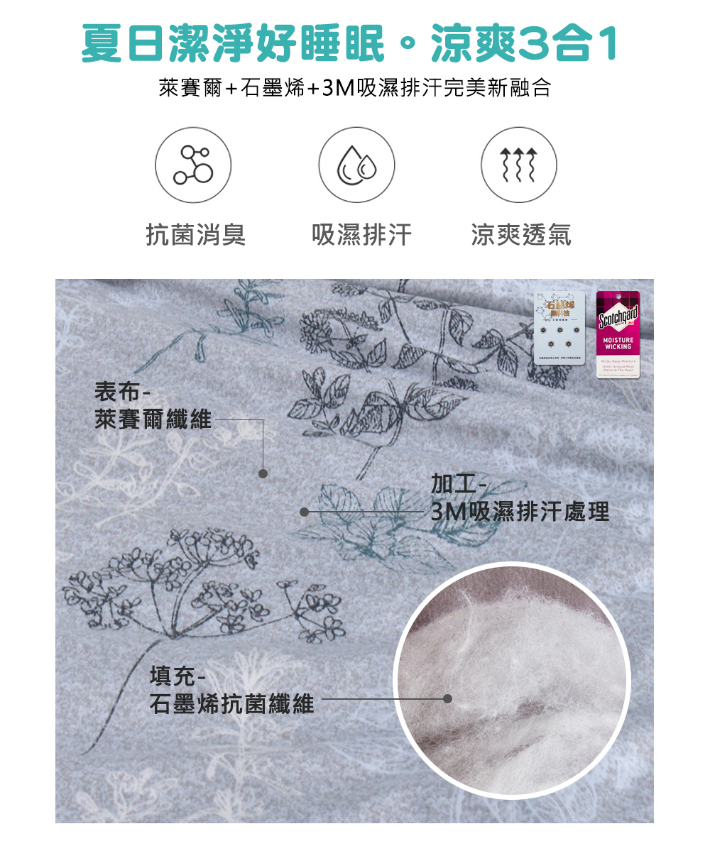 材質/成分: 表布:50%萊賽爾纖維50%聚酯纖維(3M吸濕排汗加工)/填充物:100%聚酯纖維(含石墨烯)