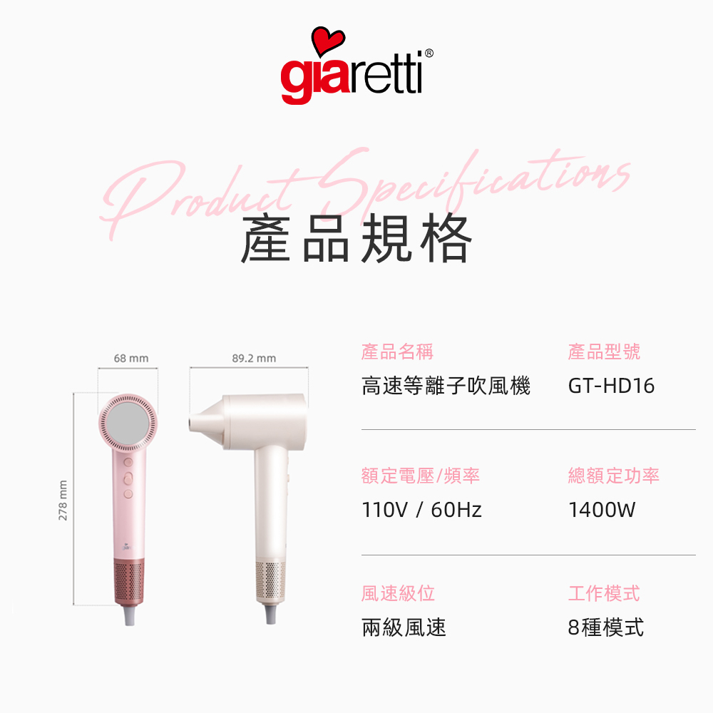 產品名稱: 【義大利Giaretti珈樂堤】高速等離子吹風機 GT-HD16