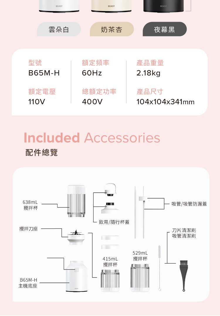 配件: 主機/638ml攪拌杯/攪拌刀座/飲用旅行杯蓋/415ml攪拌杯/529ml攪拌杯/吸管/吸管防漏蓋/刀片清潔刷/吸管清潔刷