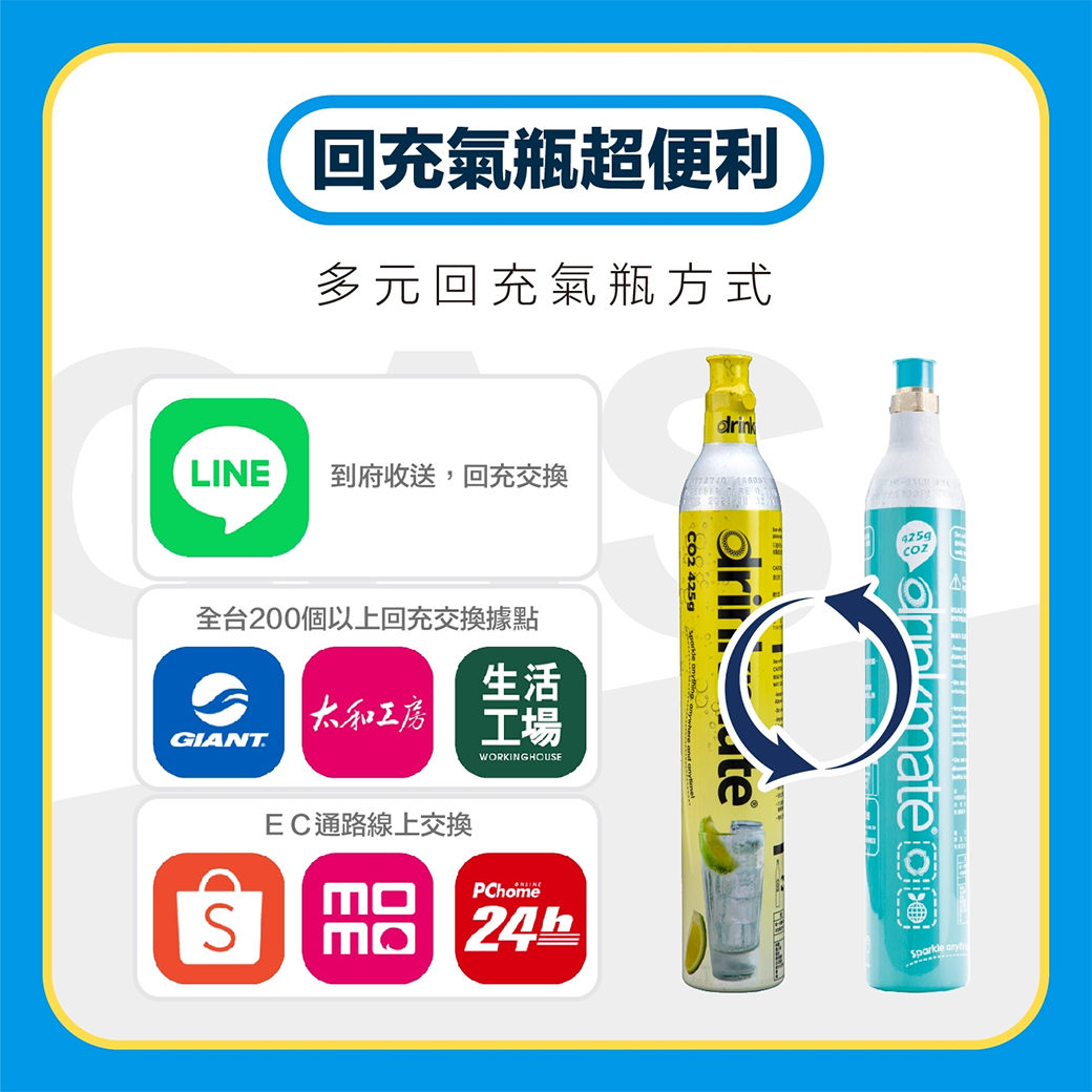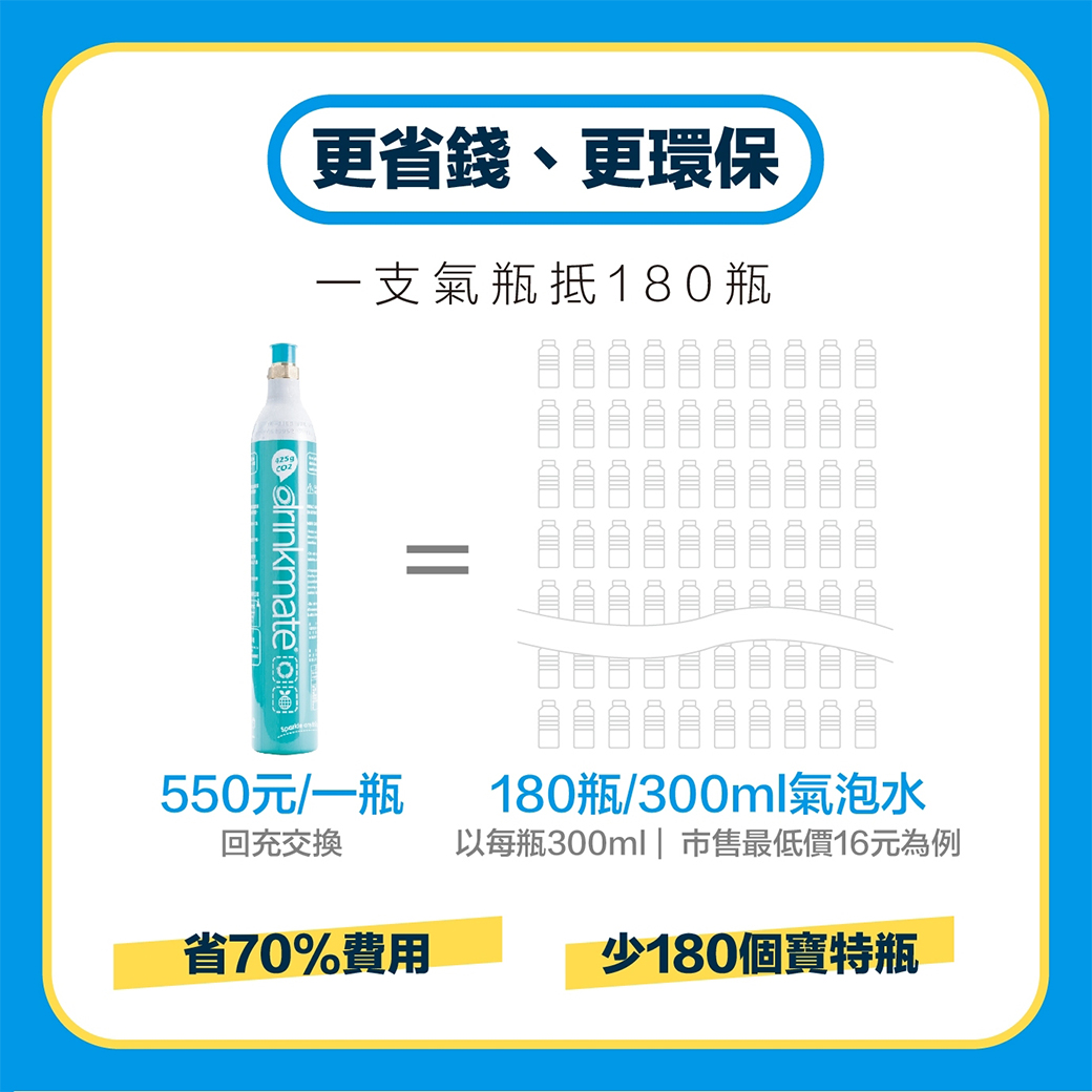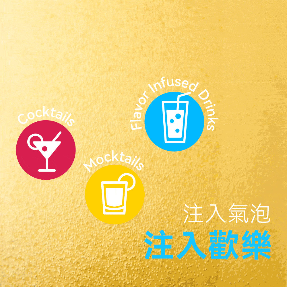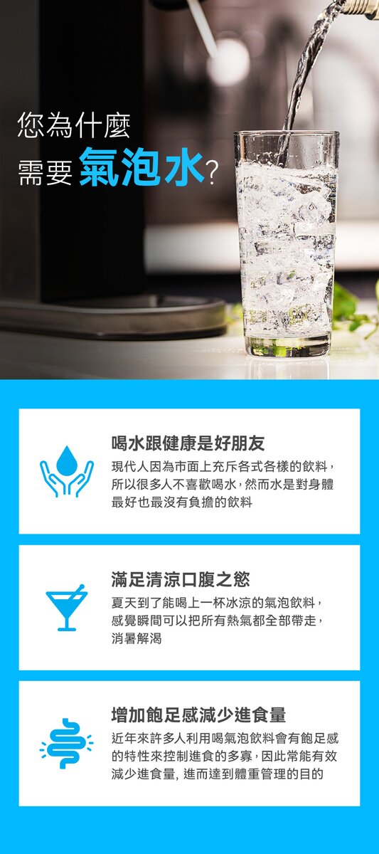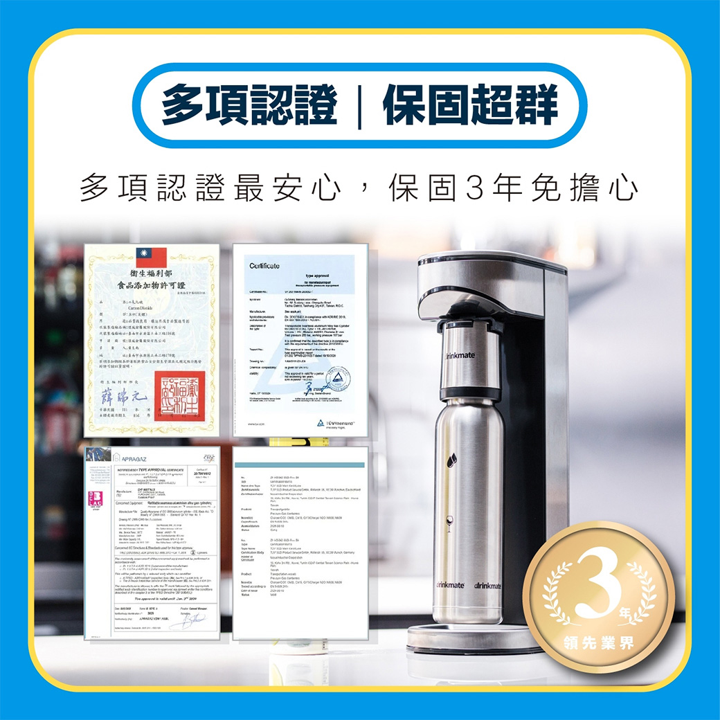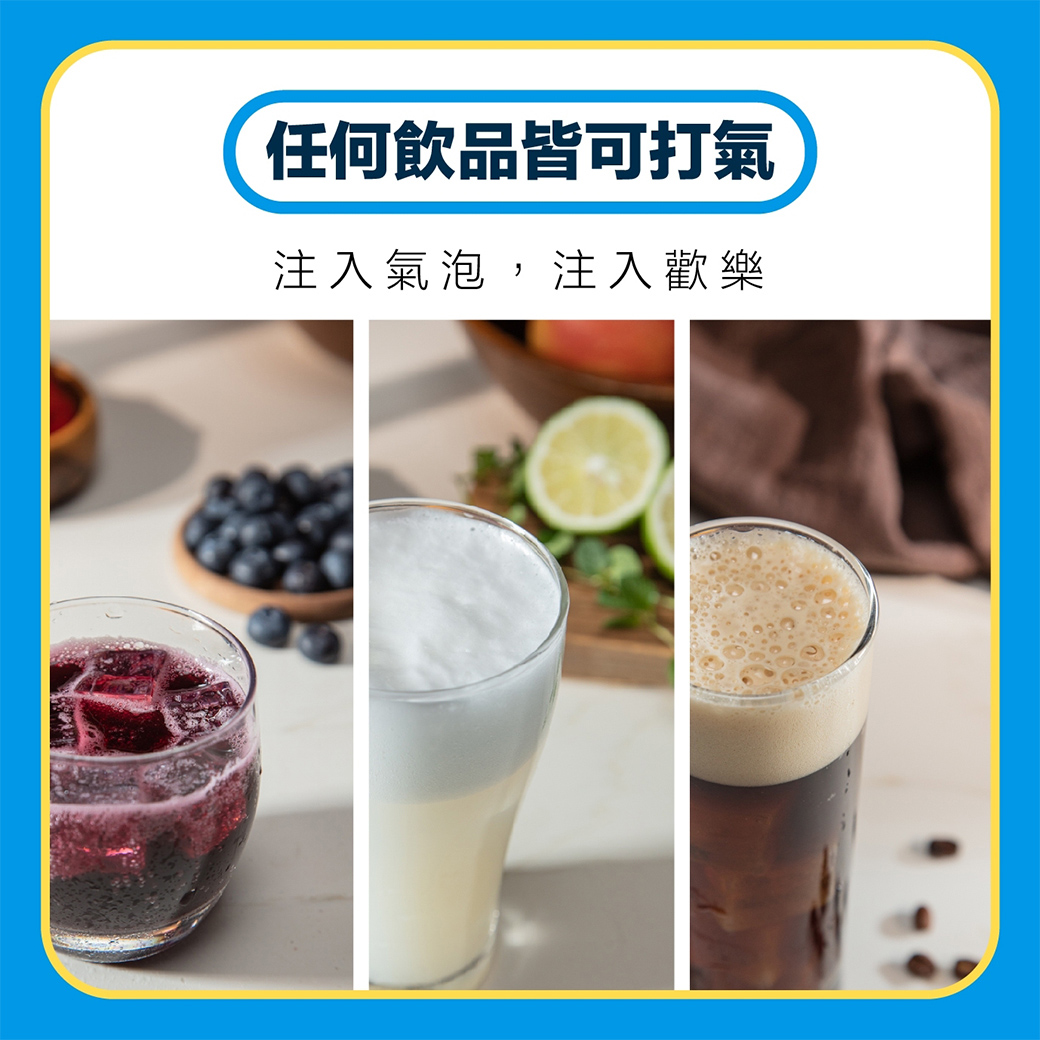 配件: 氣泡機主機*1/0.68L不鏽鋼保冷瓶*1/425g專用氣瓶*1/說明書&保固卡*1