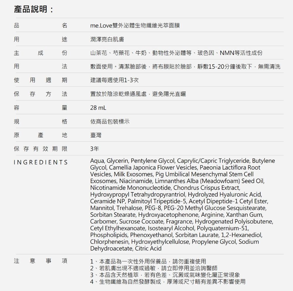 產品名稱: 【me.Love】雙外泌體生物纖維光萃面膜
