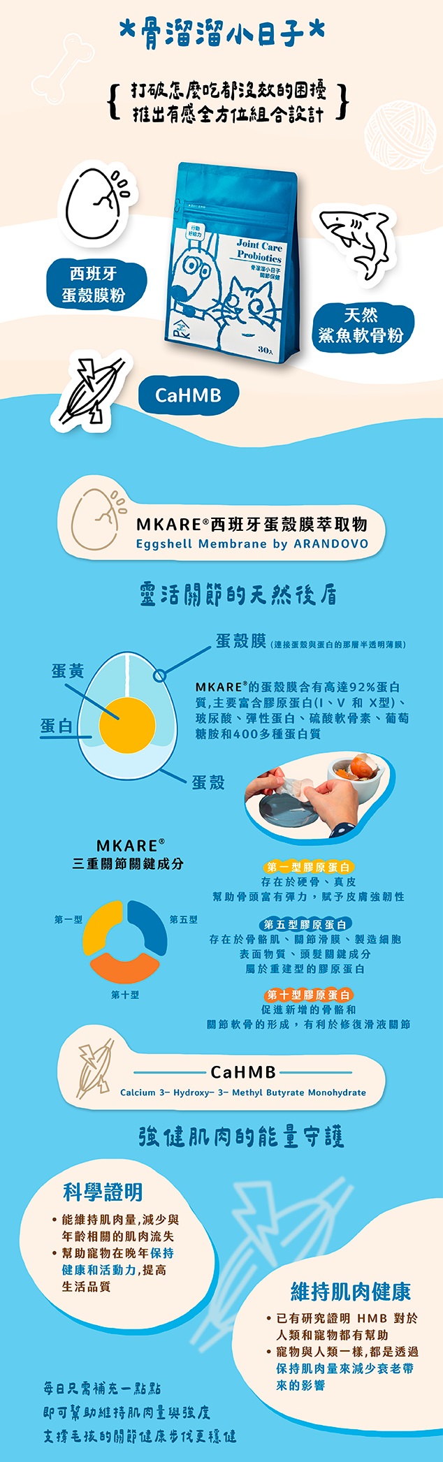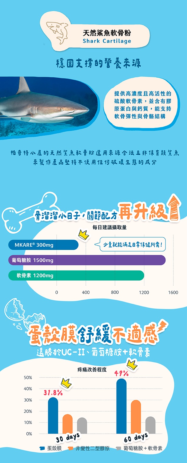 內容物成分: 麥芽糊精、甲基硫醯基甲烷(MSM)、支鏈胺基酸(L-白胺酸、L-異白胺酸、L-α胺基異戊酸)、蛋殼膜粉(含I、V、X型膠原蛋白)、酵母抽出物、鯊魚軟骨粉、維生素C、豬肉粉、二氧化矽、β-羥基-β-甲基丁酸鈣粉(CaHMB)、 維生素D3