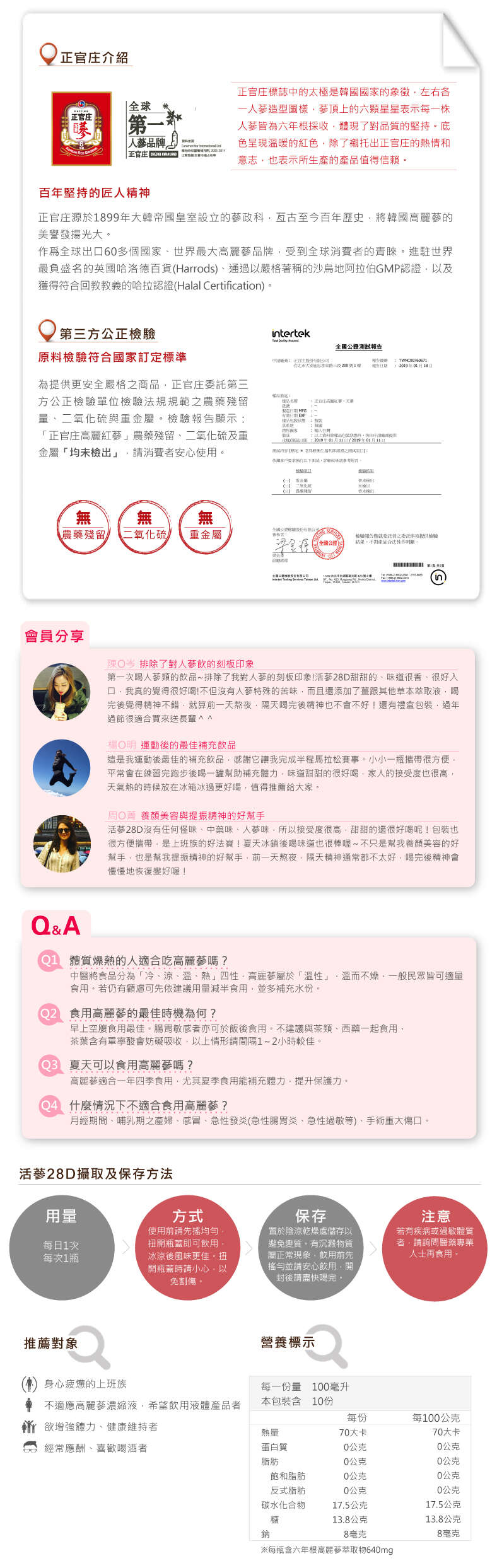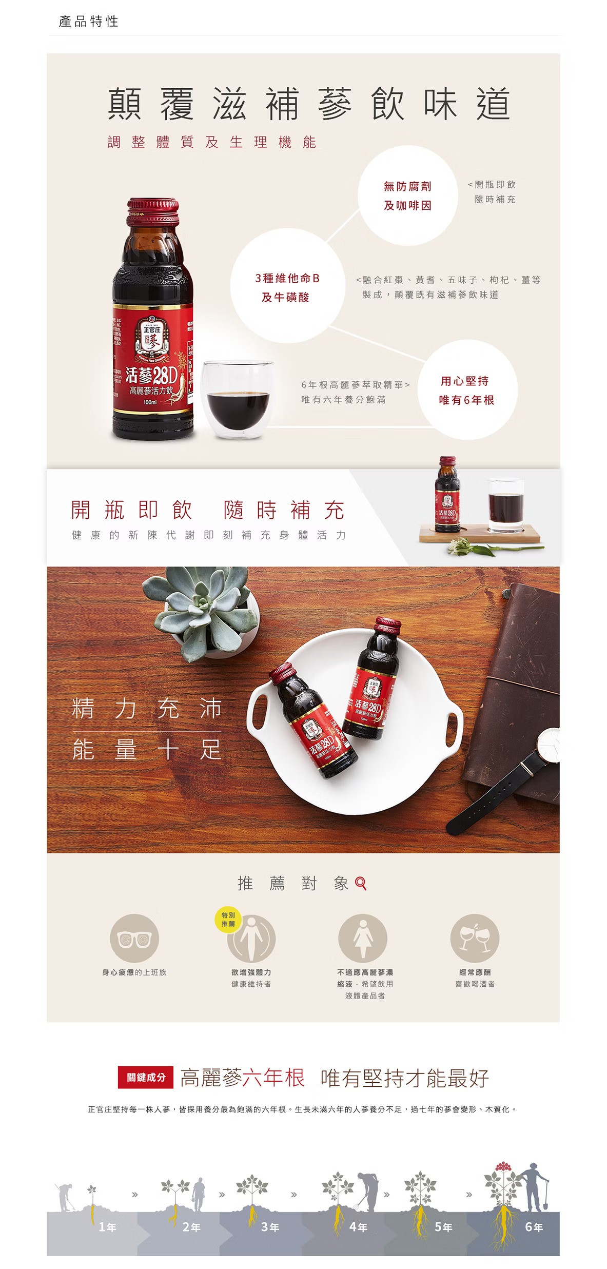 產品成分:水、轉化糖、焦糖糖漿、草本萃取物 (薑、紅棗、五味子、枸杞、黃耆)、六年根高麗蔘萃取物、牛磺酸、檸檬酸、聚山梨醇酐脂肪酸酯八十、香料、檸檬酸鈉、菸鹼醯胺、維生素B6、維生素B2