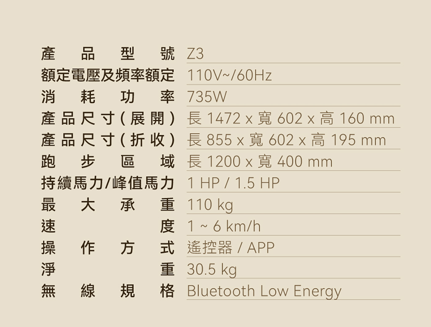 尺寸/規格: 展開尺寸 : 長1472 x寬602 x x 高 160 (mm);折收尺寸: 長855 x寬602 x 高195(mm);跑步區域 : 長 1200 x 寬 400 (mm)
