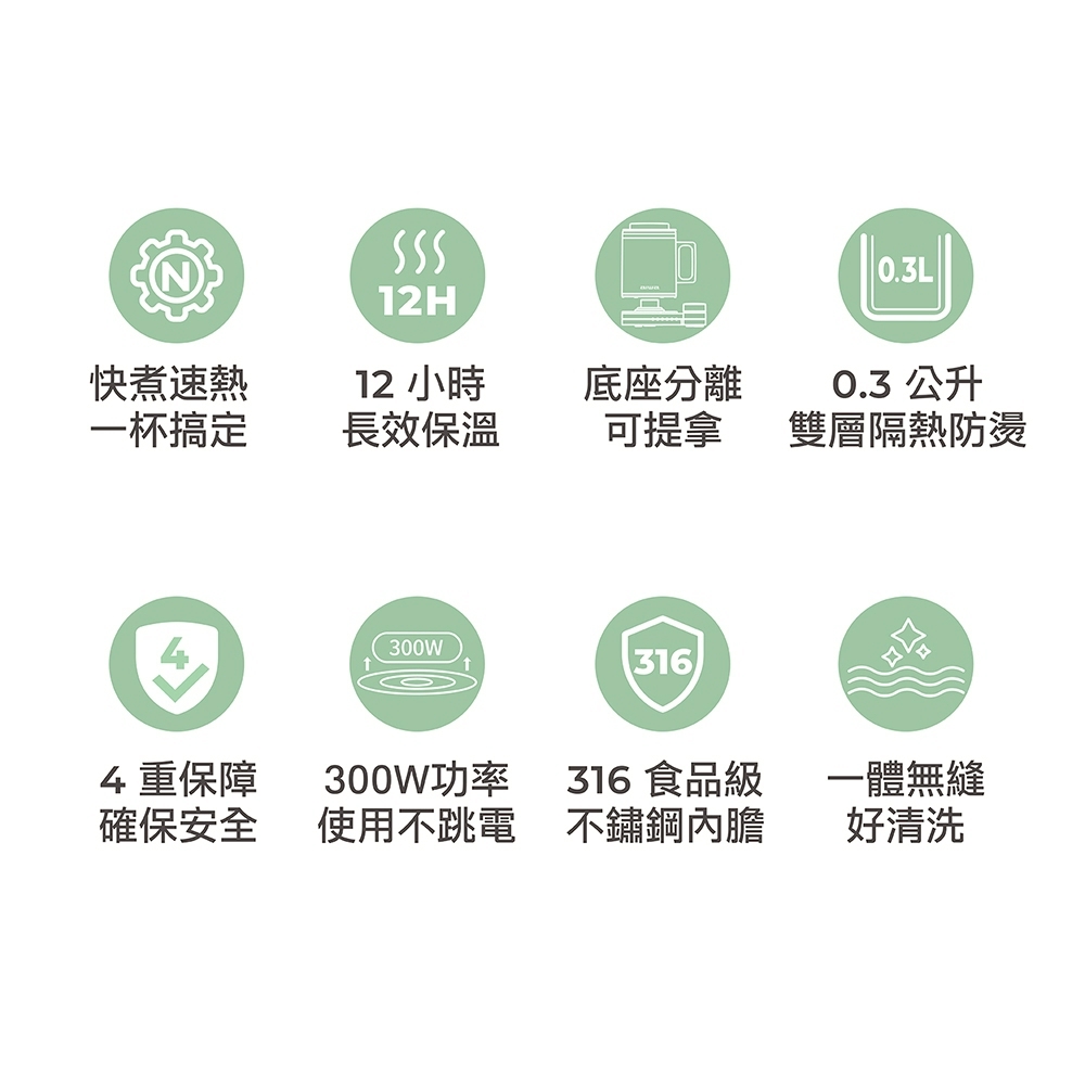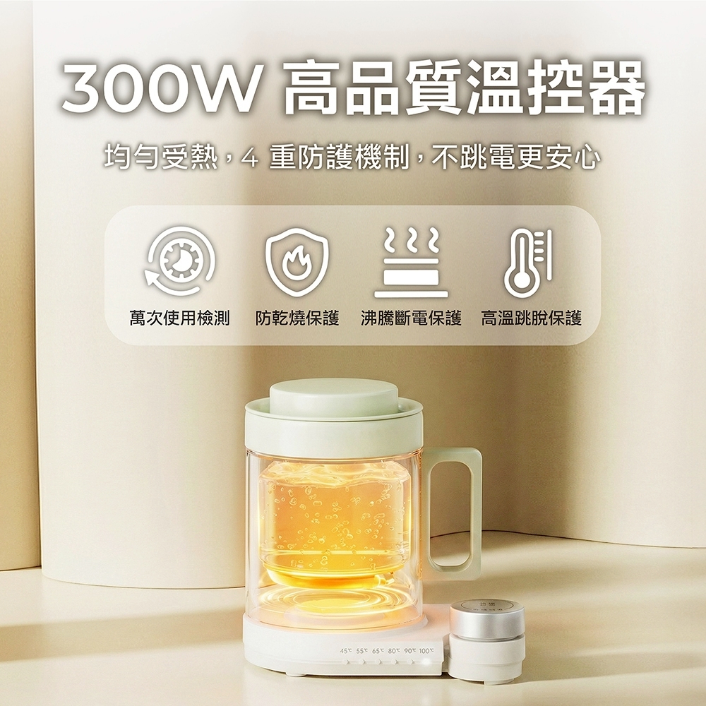 配件: 配件(内容物): AHC-300 防燙保溫養生杯x1(含底座、壺、蓋、電源線)、 說明書x1(含保固卡)