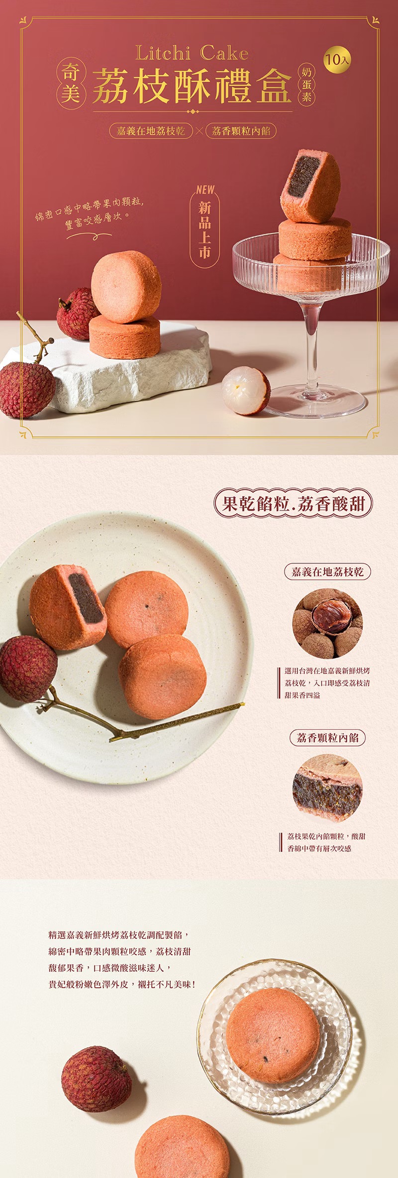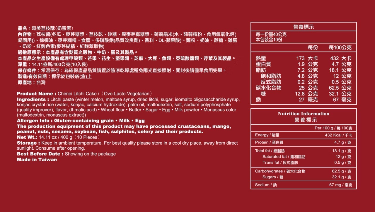 內容物成分: 荔枝醬(冬瓜、麥芽糖漿、荔枝乾、砂糖、異麥芽寡糖漿、蒟蒻晶米(水、蒟蒻精粉、食用氫氧化鈣(凝固用))、棕櫚油、麥芽糊精、食鹽、多磷酸鈉(品質改良劑)、香料、DL-蘋果酸)、麵粉、奶油、蔗糖、雞蛋、奶粉、紅麴色素(麥芽糊精、紅麴萃取物)
