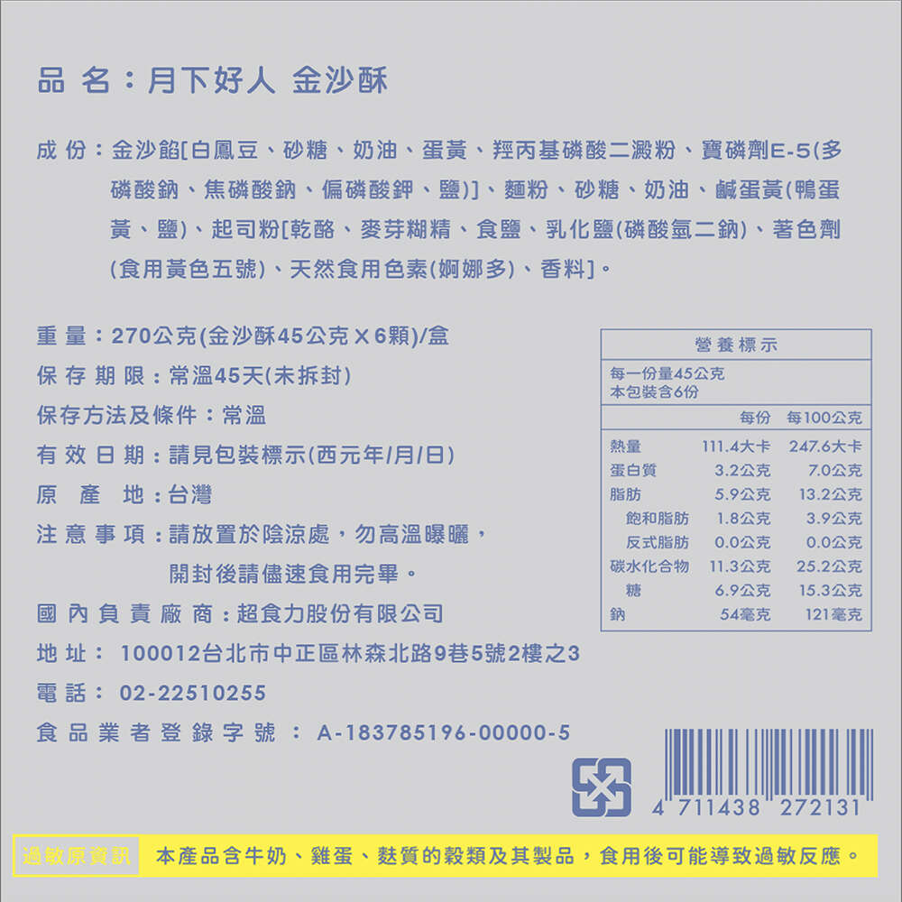 內容物:270g(金沙酥45gX6顆)/盒