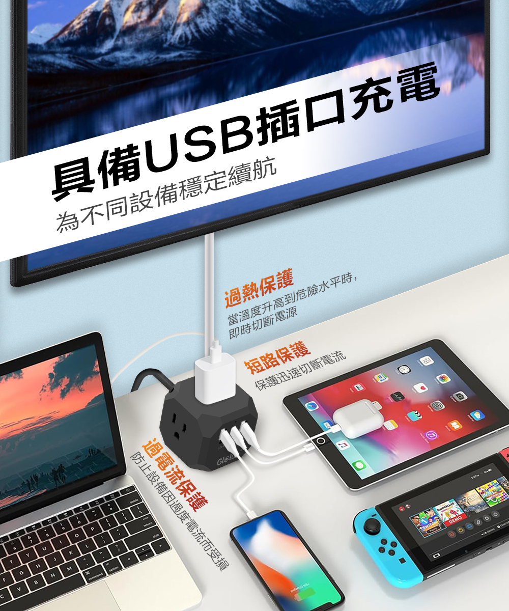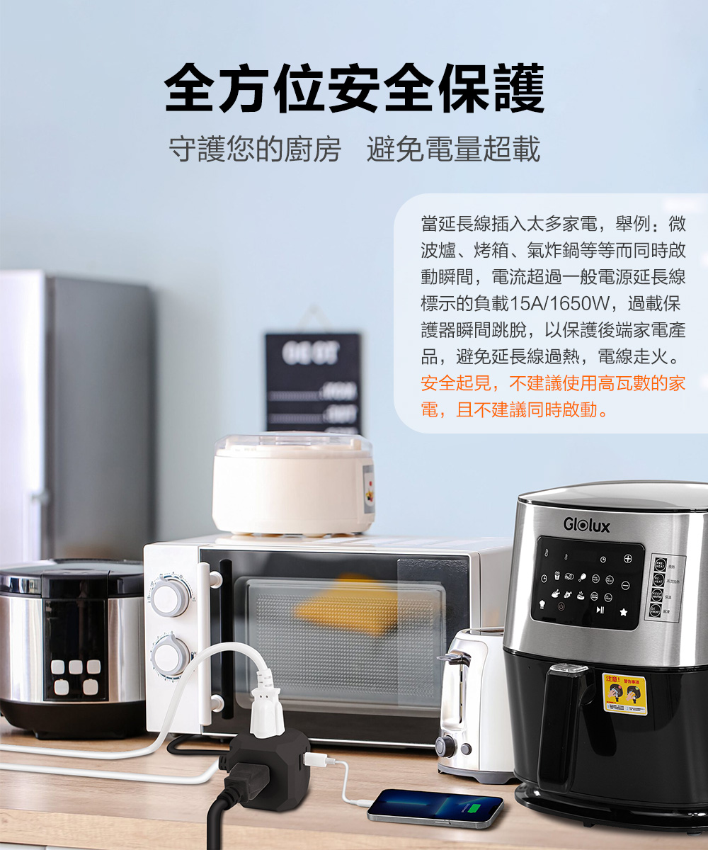 內含:【Glolux】15W流星錘3插3USB延長線2.1米EC200-20W3AB(質感黑)