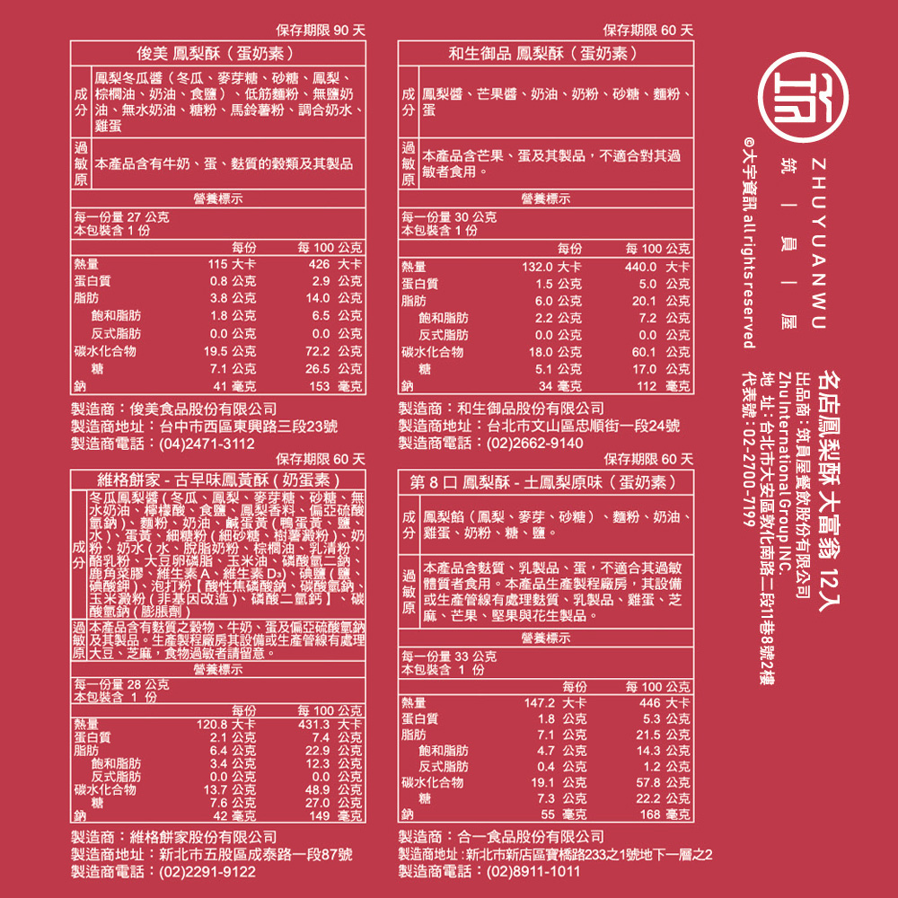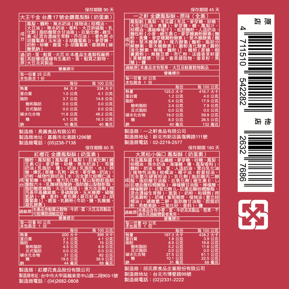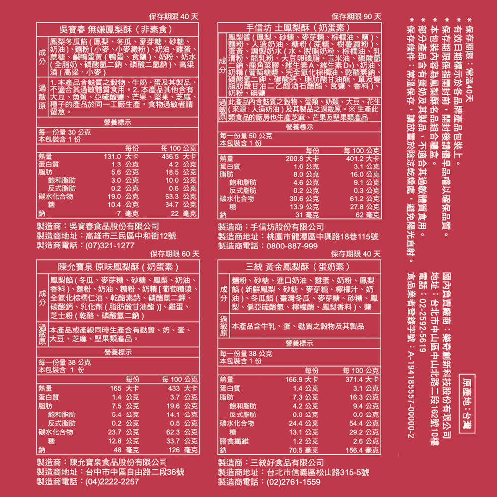過敏原資訊: 俊美 鳳梨酥(蛋奶素):本產品含有牛奶、蛋、麩質的穀類及其製品。 和⽣御品 鳳梨酥(蛋奶素):本產品含芒果、蛋及其製品,不適合對其過敏者食用。 吳寶春 無嫌鳳梨酥(非素食):1. 本產品含麩質之穀物、牛奶、蛋及其製品,不適谷真過敏體質食用。。2.本產品其他含有大豆、魚類、亞硫酸鹽、芒果、堅果、芝麻、種子的產品於同一工廠生產,食物過敏者請留意。 ⼿信坊 土鳳梨酥(蛋奶素):此產品內含麩質之穀物、蛋類、奶類、大豆、花生(來源:人造奶油)及其製品之過敏原。 生產此類食品的廠房也生產芝麻、芒果及堅果類產品。 ⼤王千⾦ 台農17號⾦鑽鳳梨酥(蛋奶素):奶、蛋、麩質、大豆 本產品生產製程廠房,其設備或產線有生產奶、蛋、麩質之穀物、大豆及其製品。 ⼀之軒 原味⾦鑽鳳梨酥(全素):本產品含有堅果、大豆及麩質穀物製品。 維格餅家 古早味鳳黃酥(蛋奶素):本產品含有麩質之穀物、牛奶、蛋及偏亞硫酸氫鈉及其製品。生產製程廠房其設備或生產管線有處理大豆、芝麻,食物過敏者請留意。 第8⼝ ⼟鳳梨酥原味(蛋奶素):本產品含麩質、乳製品、蛋,不適合其過敏體質者食用。本產品生產製程廠房,其設備或生產管線有處理麩質、乳製品、雞蛋、芝麻、芒果、堅果與花生製品。 陳允寶泉 原味鳳梨酥(蛋奶素):本產品或產線同時生產含有麩質、奶、蛋、大豆、芝麻、堅果類產品。 三統 黃⾦鳳梨酥(蛋奶素):本產品含牛乳、蛋、麩質之穀物及其製品。 紅櫻花 金鑽鳳梨酥(蛋奶素):本產品含麩質之穀物、牛奶、蛋、大豆及其製品可能導致過敏症狀。 ⼤⿊松⼩倆⼝ 鳳梨酥(蛋奶素):本產品含有小麥、蛋、牛奶及其製品、堅果,不適含箕過敏體質者食用。