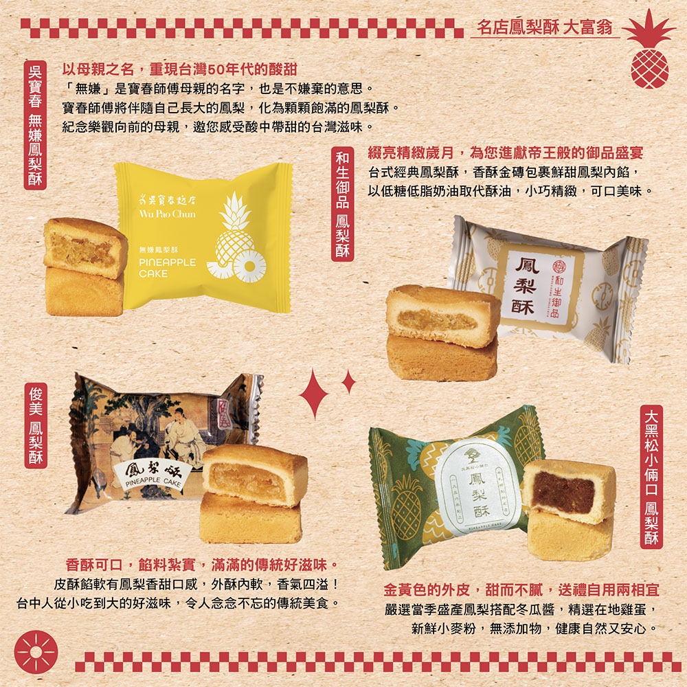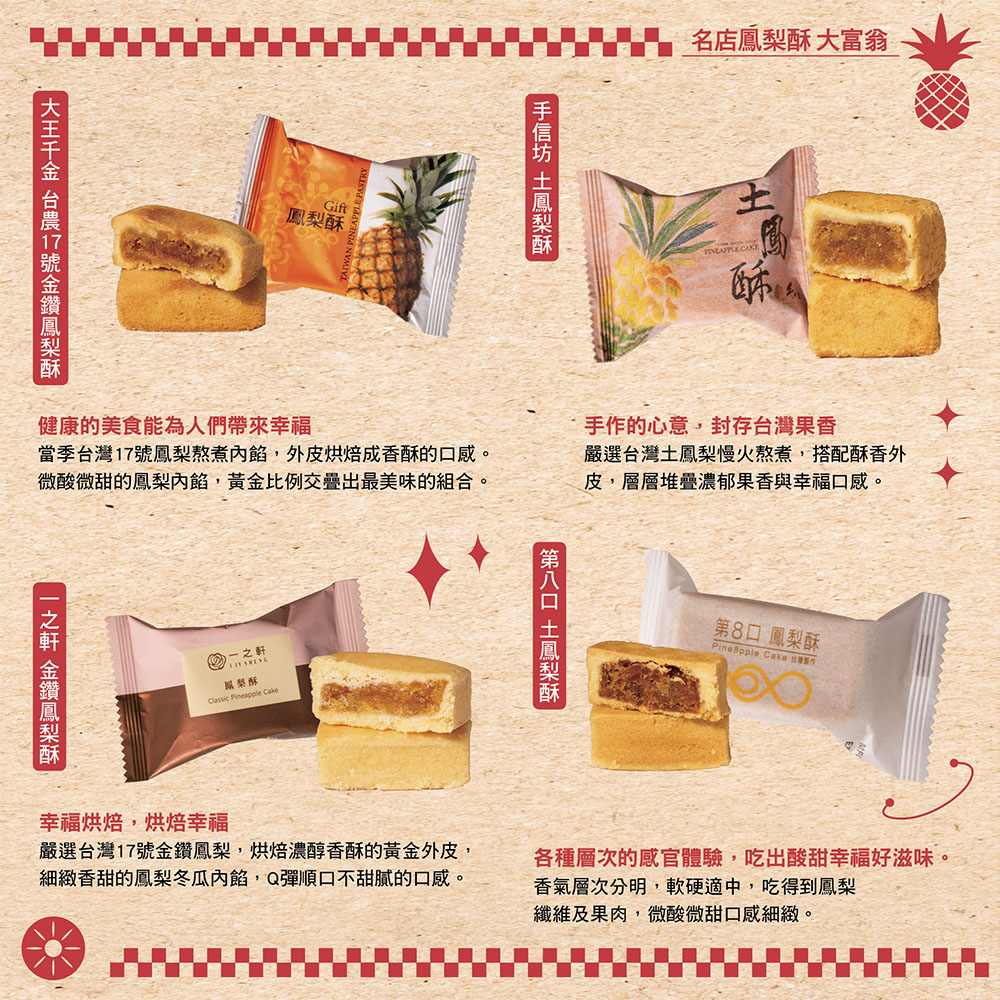 因為台灣的鳳梨酥,從不只有一種味道。不同的餡料、比例、烘焙手法,背後都是一段段真誠動人的品牌故事。