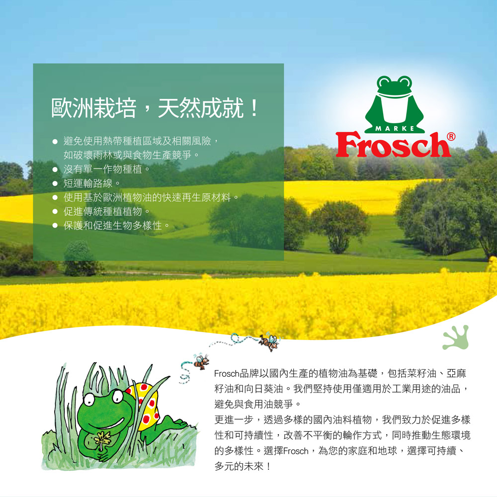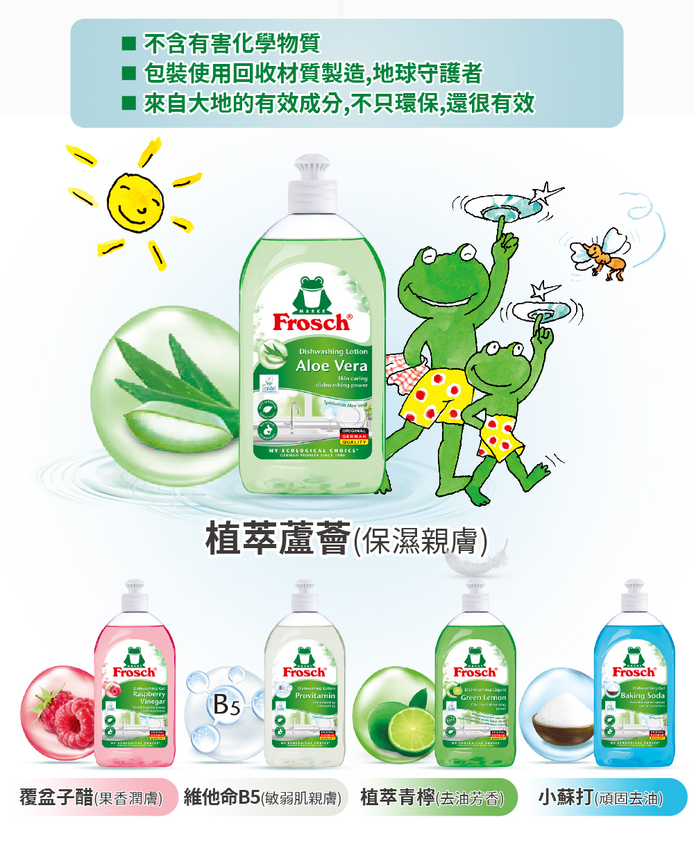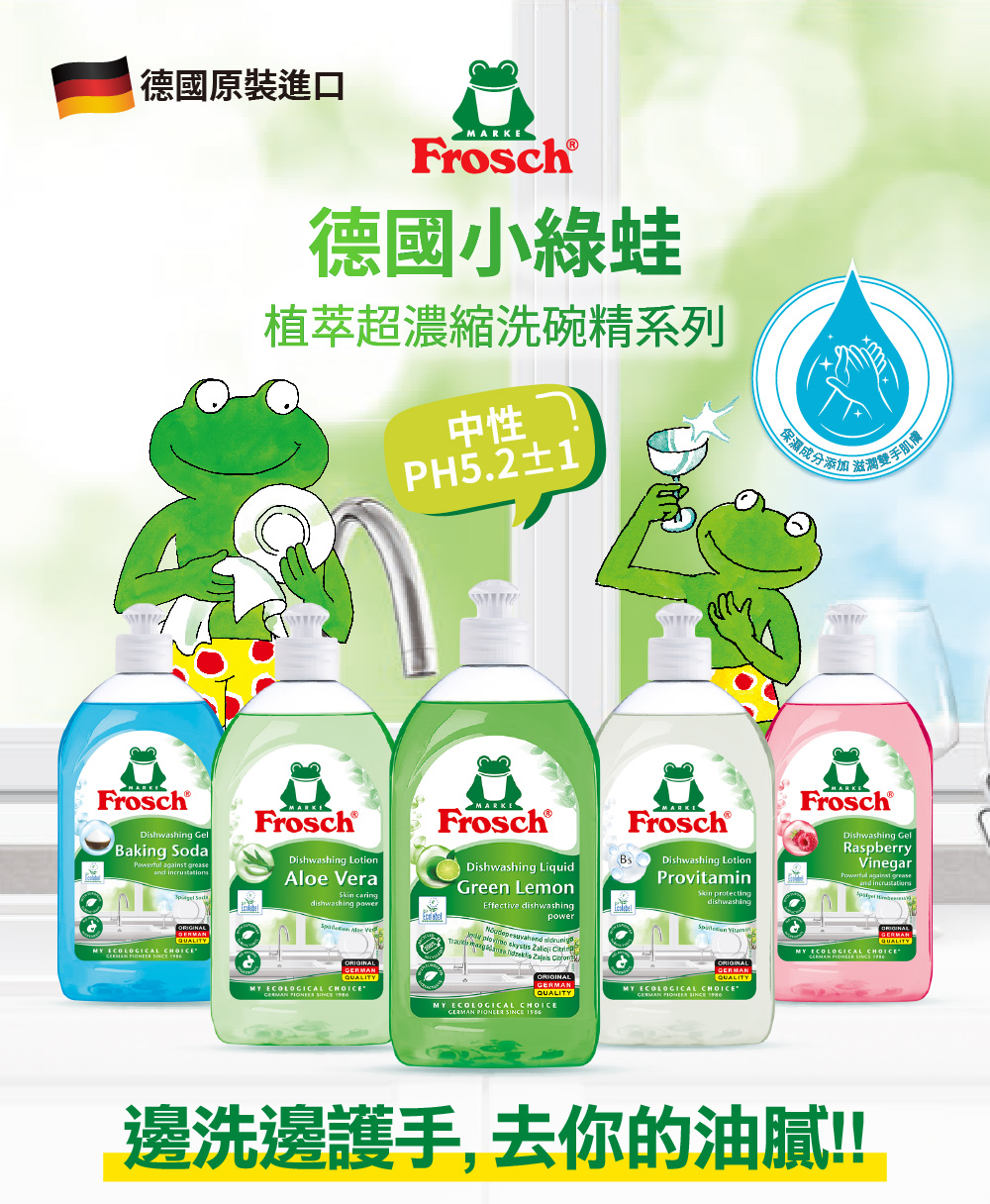 商品名稱:【Frosch 德國小綠蛙】超濃縮洗碗精500ml (敏弱肌親膚/保濕親膚/去油芳香/頑固去油/果香潤膚)