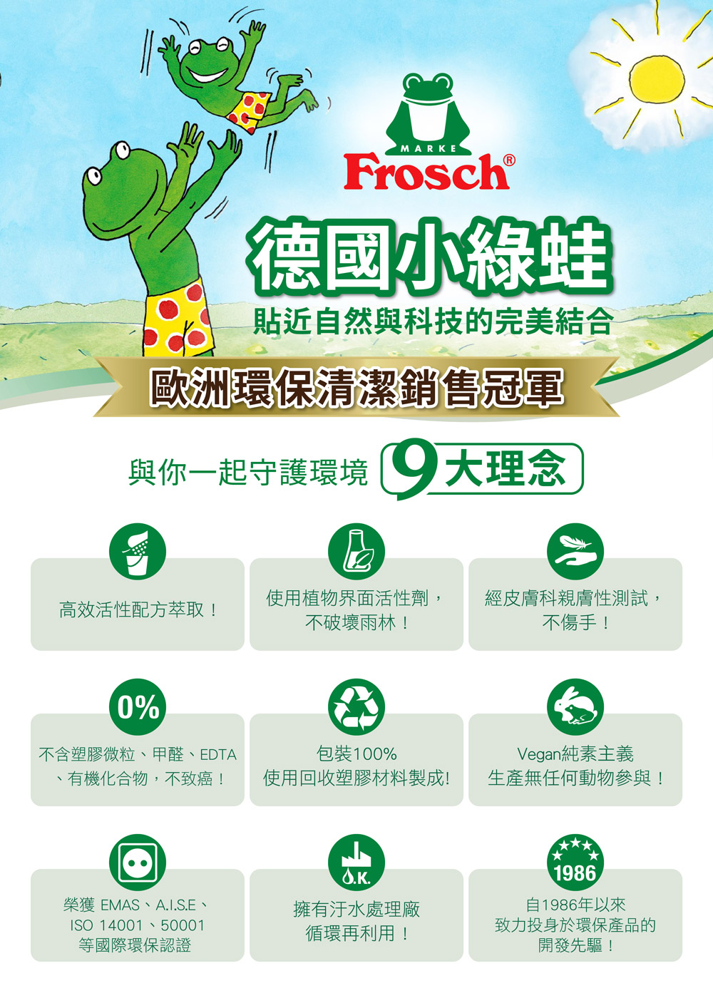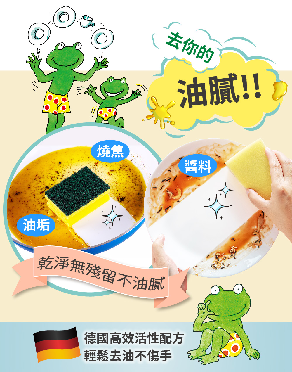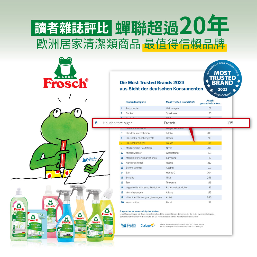 商品名稱:【Frosch 德國小綠蛙】超濃縮洗碗精500ml (敏弱肌親膚/保濕親膚/去油芳香/頑固去油/果香潤膚)