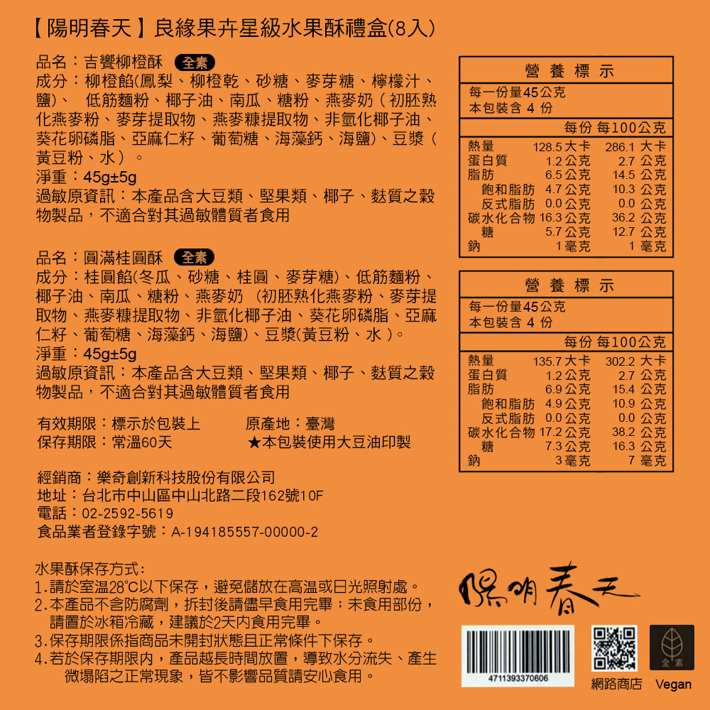 內含:【陽明春天】良緣果卉星級水果酥禮盒 (吉饗柳橙酥45g*4入+圓滿桂圓酥45g*4入)/盒
