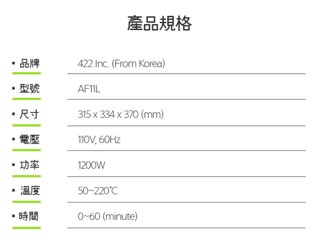 內含:【422 Inc.】韓國氣炸烤箱11L (標配配件)*1組