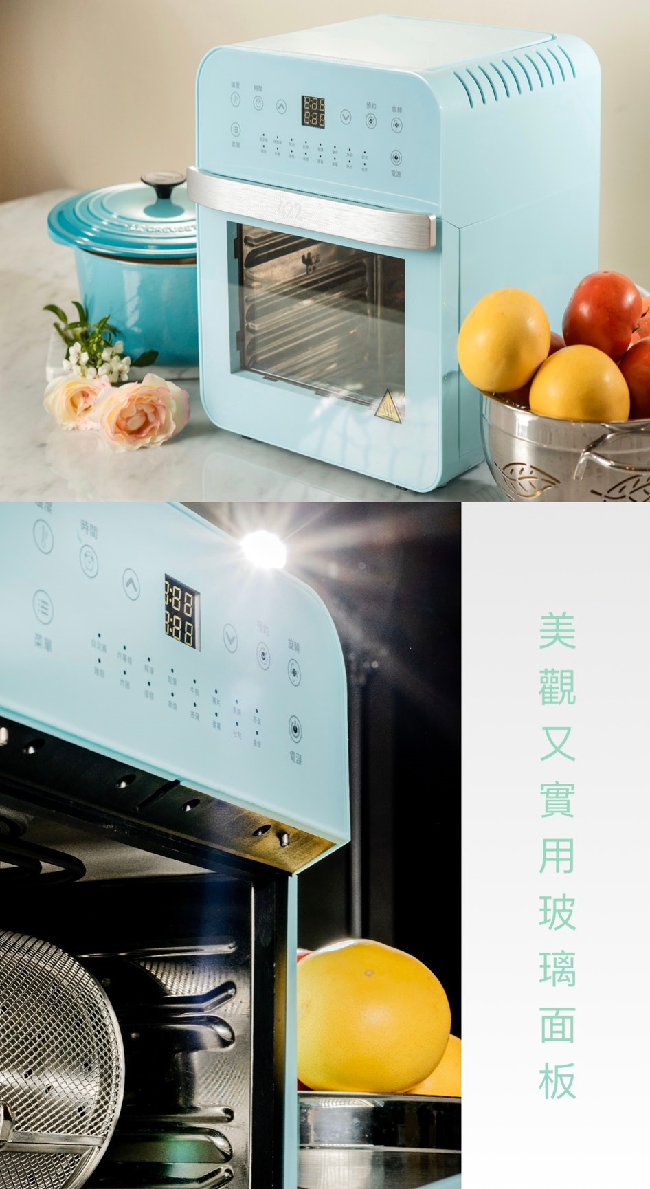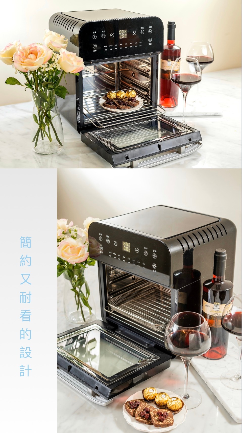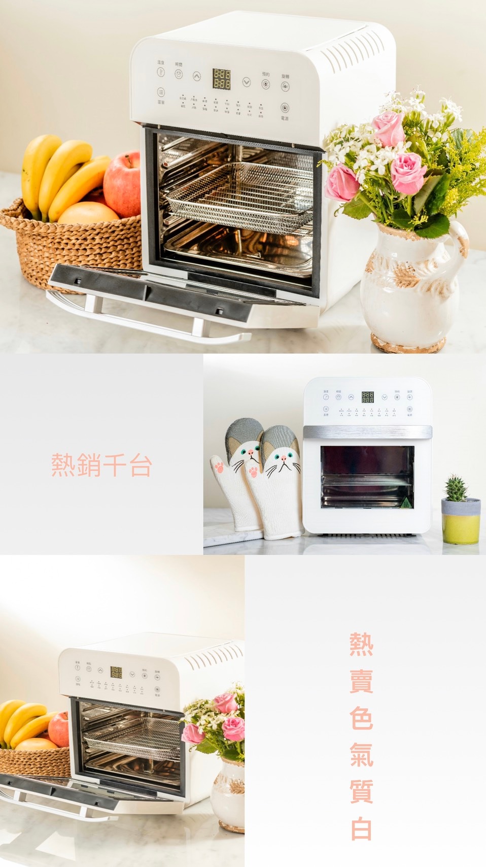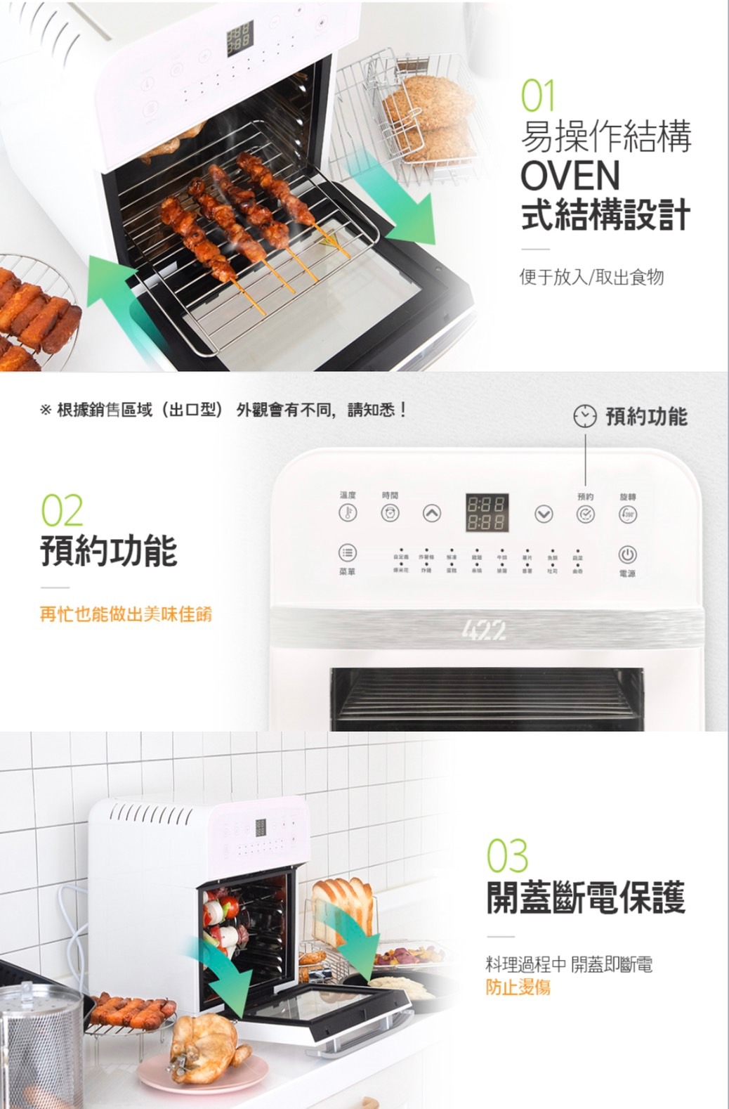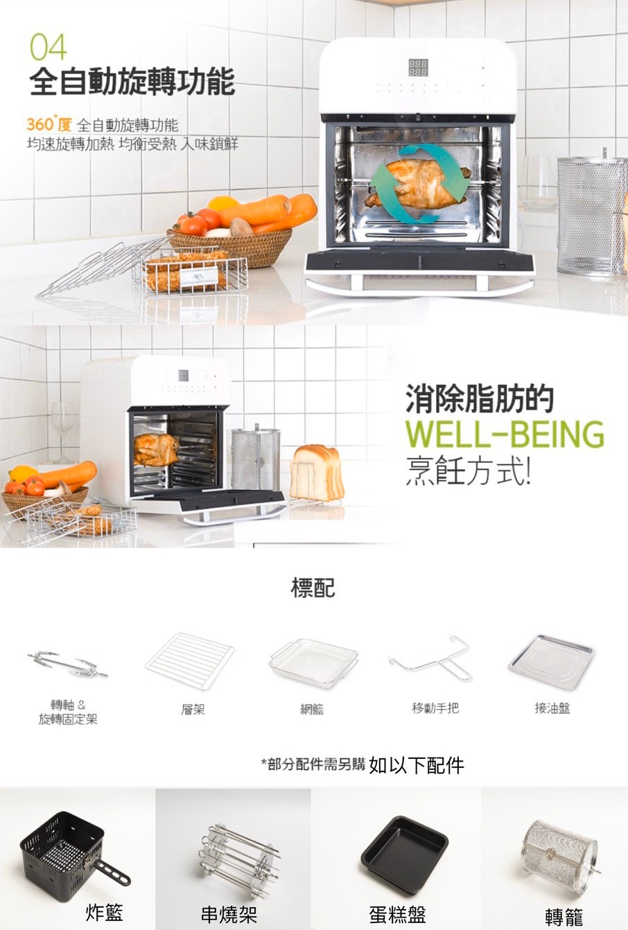 全配:層架、網籃、移動手把、接油盤、轉軸、旋轉固定架 、炸籃、蛋糕盤 、11L轉籠、烤串叉