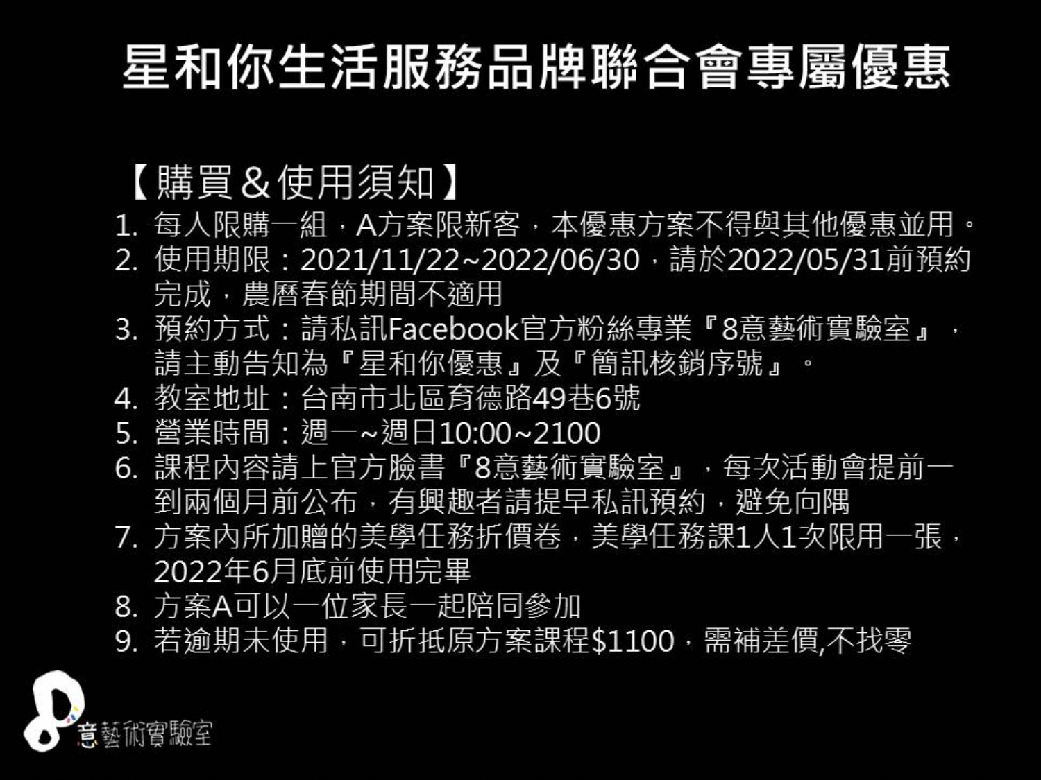 3. 預約方式:請私訊Facebook官方粉絲專業『8意藝術實驗室』,請主動告知為『星和你優惠』及『簡訊核銷序號』。