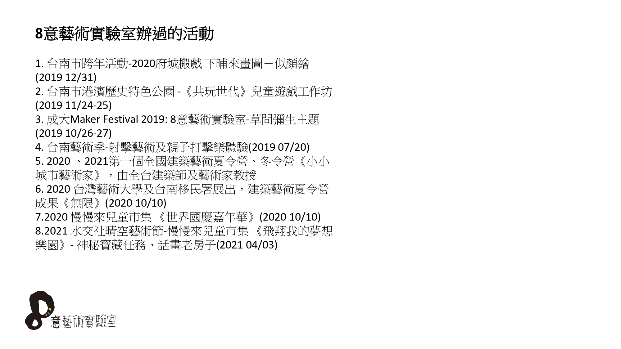 6. 課程內容請上官方臉書『8意藝術實驗室』,每次活動會提前一到兩個月前公布,有興趣者請提早私訊預約,避免向隅