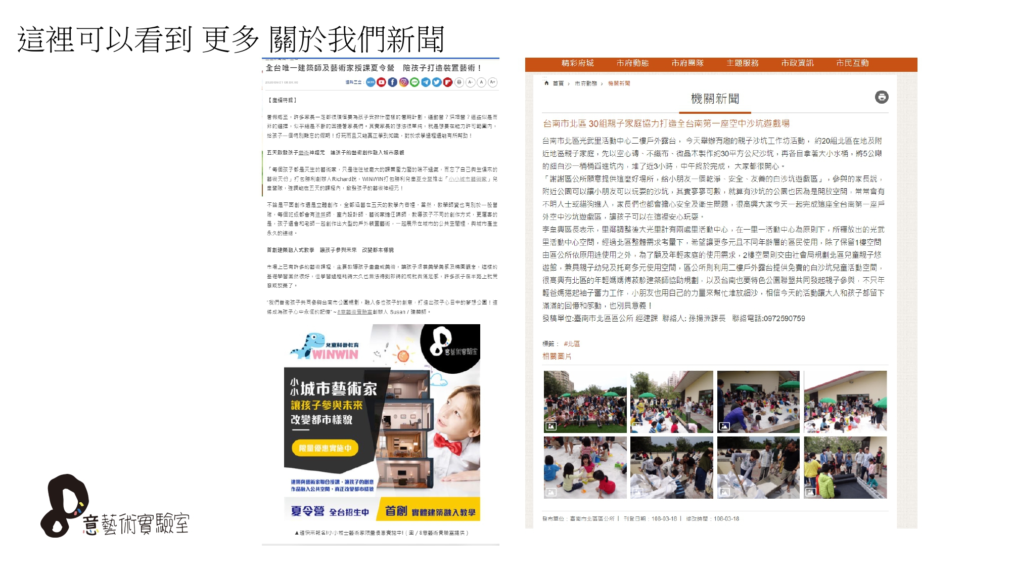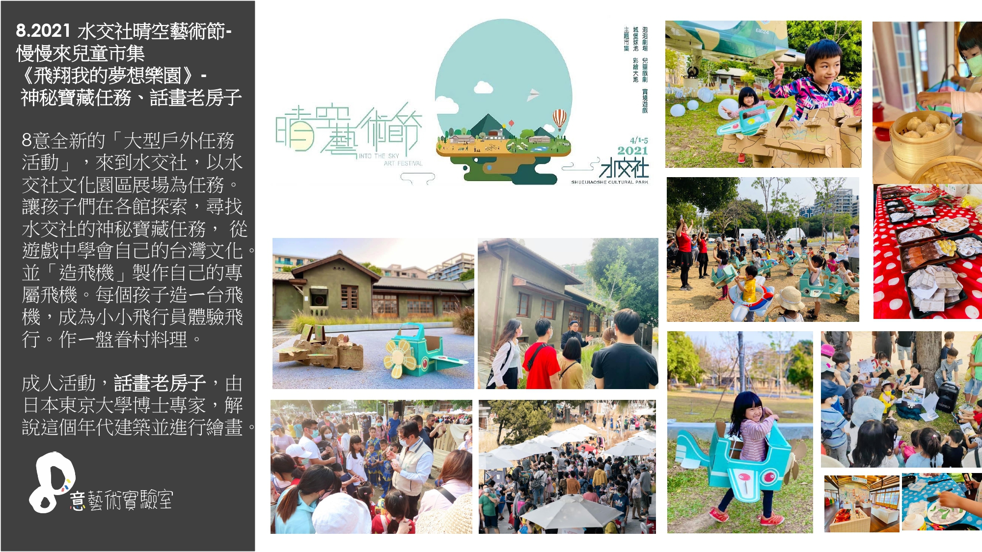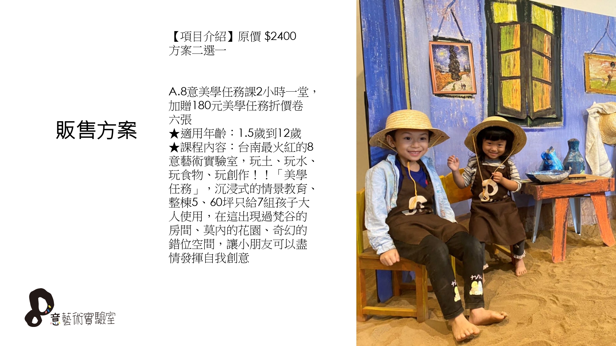 ★課程內容:台南最火紅的8意藝術實驗室,玩土、玩水、玩食物、玩創作!!「美學任務」,沉浸式的情景教育、整棟5、60坪只給7組孩子大人使用,在這出現過梵谷的房間、莫內的花園、奇幻的錯位空間,讓小朋友可以盡情發揮自我創意