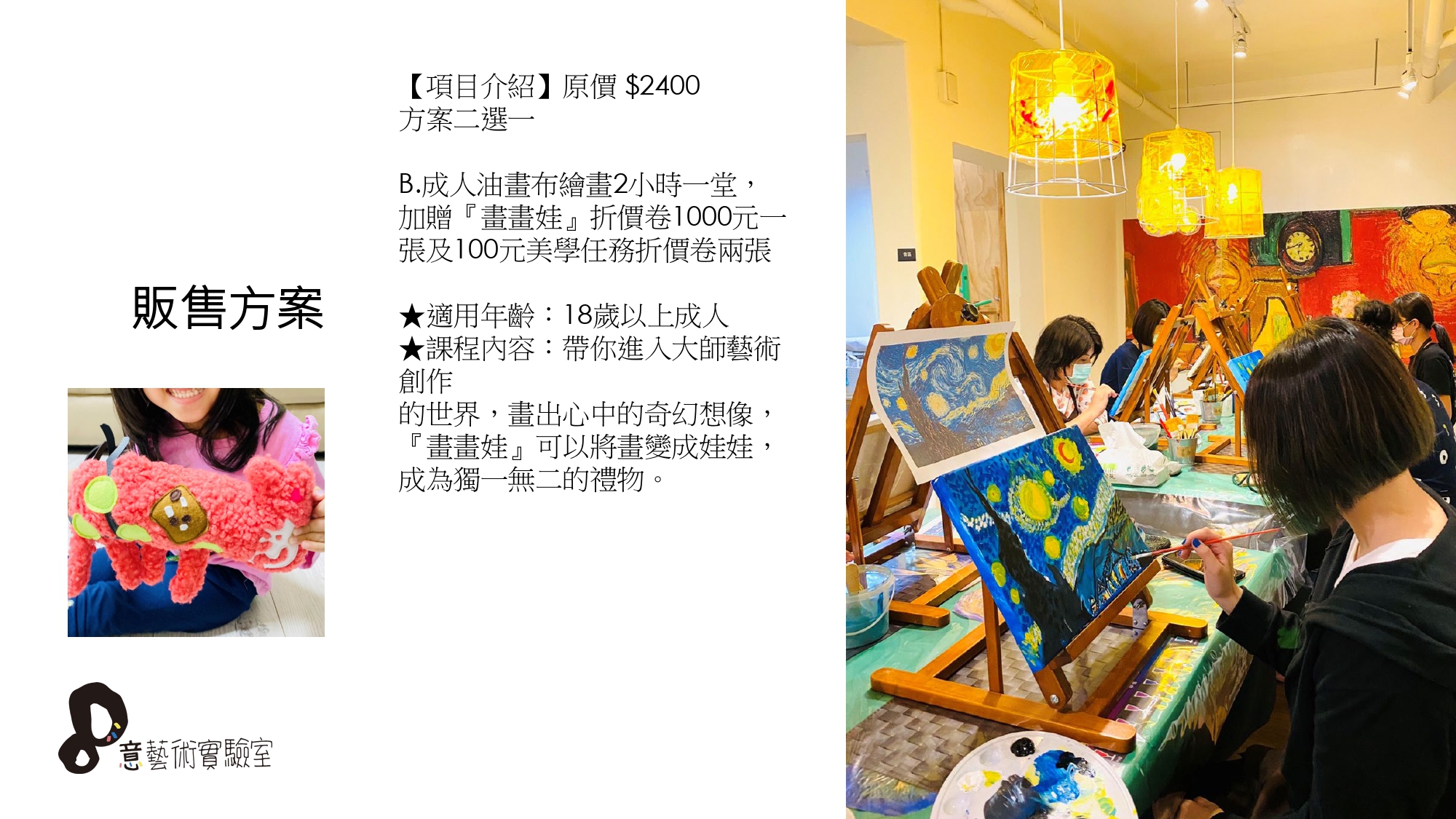 B.成人油畫布繪畫2小時一堂,加贈『畫畫娃』折價卷1000元一張及100元美學任務折價卷兩張