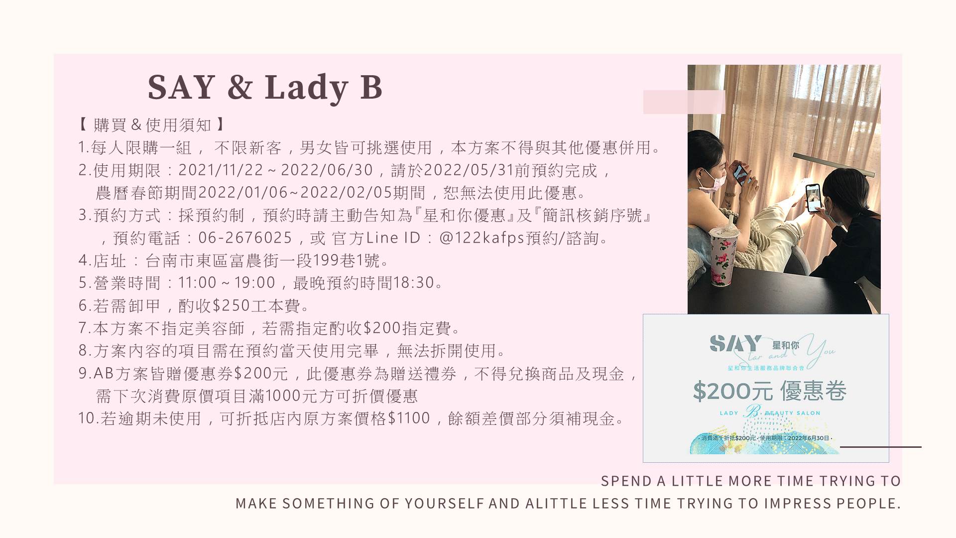 2.使用期限:2021/11/22~2022/06/30,請於2022/05/31前預約完成,農曆春節期間2022/01/06~2022/02/05不適用。