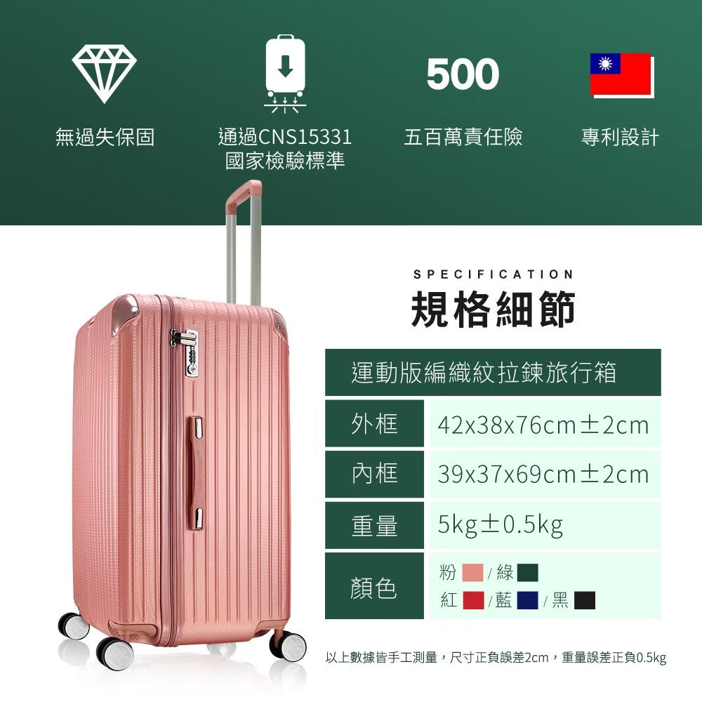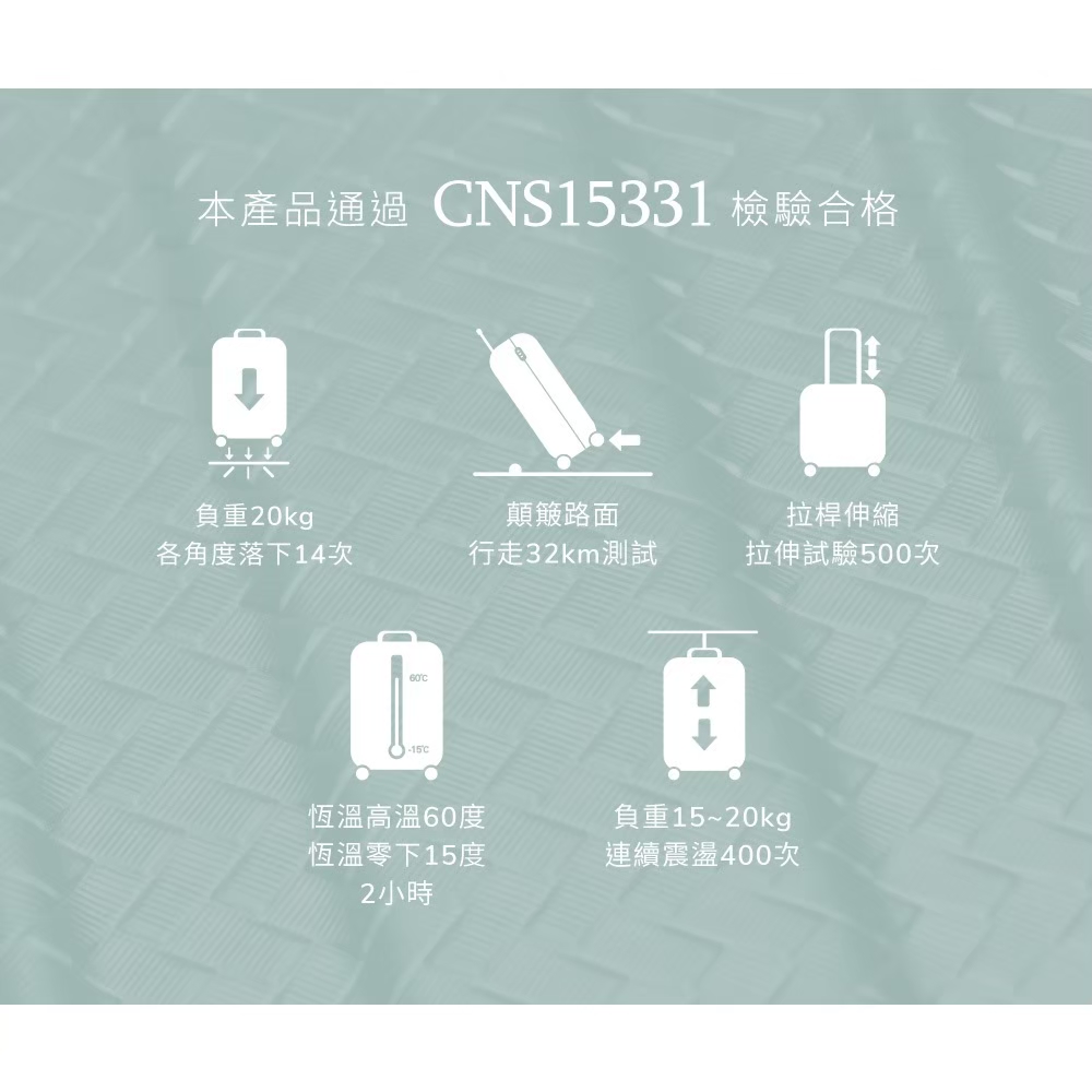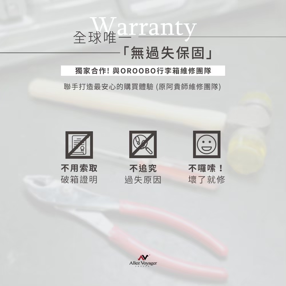 ※AllezVoyager 全系列產品皆通過BSMI測試及認證,其堅固品質皆於標準之上,為避免您的消費權益受損,當您發現旅行箱在航空公司託運後,發生毀損的情況,請務必於離開機場前、向該航空公司辦理申訴索賠的手續。