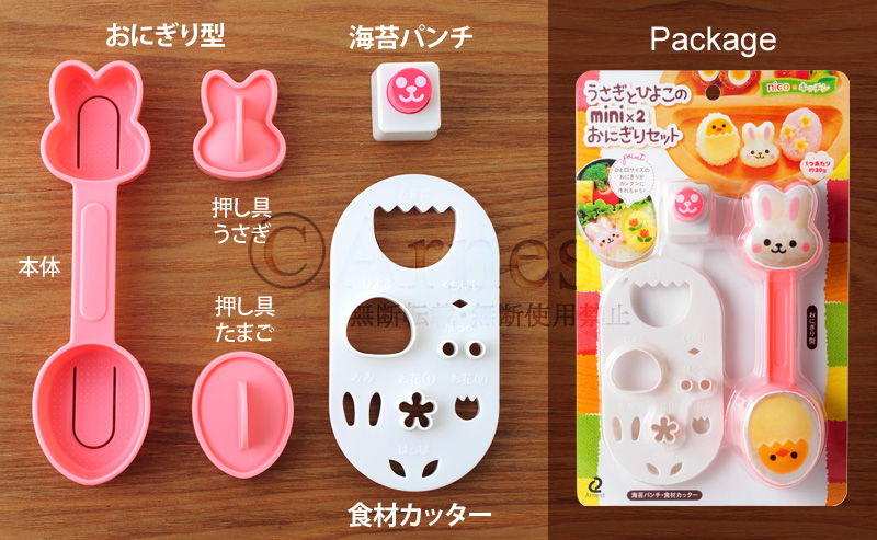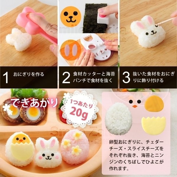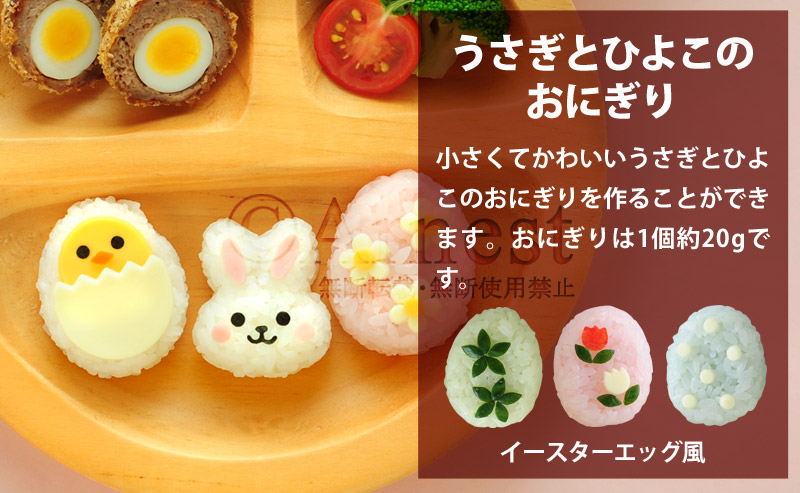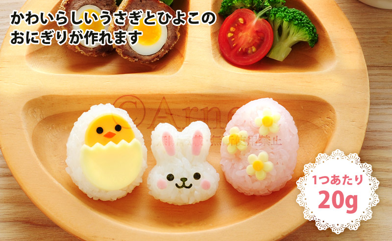 日本最新上市的兔兔與小雞迷你飯糰模型,一組就有可愛的兔兔和小雞兩種造型兔兔一直深受大家喜愛,加上可愛的蛋形模型,可以做成小雞、花朵或是雞蛋的變化一個飯糰約20g的米飯,迷你好入口,帶便當很適合,做成Party活動小點心也很討喜