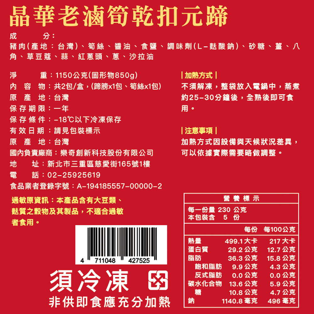 內含:【晶華酒店】老滷筍乾扣元蹄-1150g(固形物850)