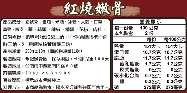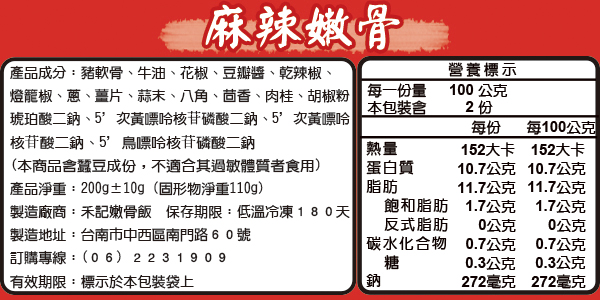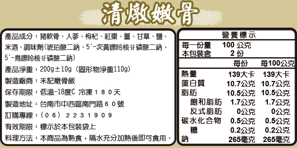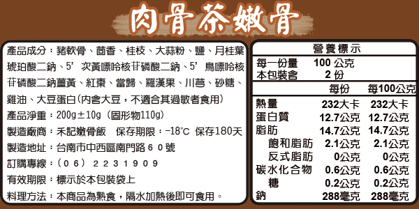 所謂嫩骨是取用每頭豬位於肋骨下方的排骨,經裁切並透由獨家專利壓力鍋燉煮而成,入口軟嫩彈牙,軟骨部分好似果凍般,富含膠質及營養,適合牙口不佳的老人及幼童食用。