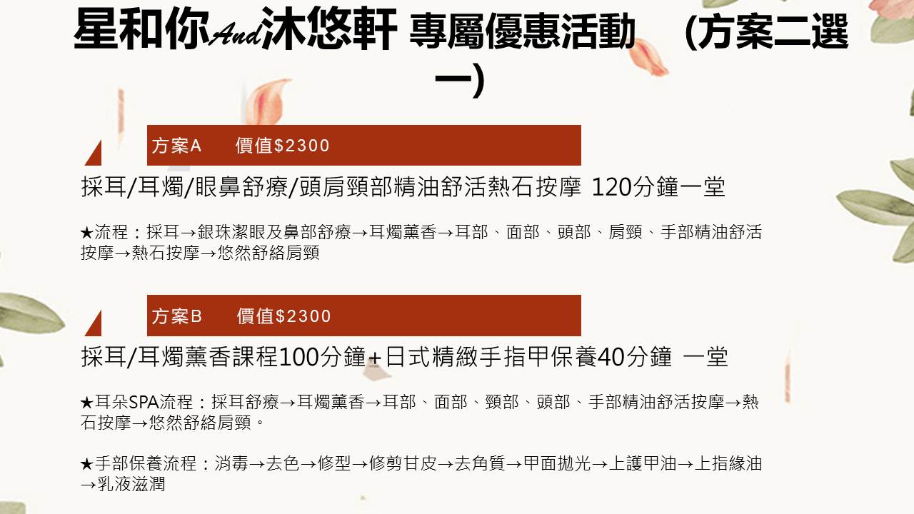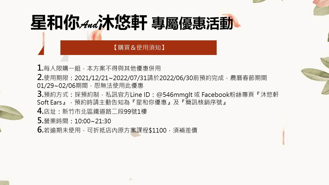 3.預約方式:採預約制,私訊官方Line ID:@546mmglt 或 Facebook粉絲專頁『沐悠軒Soft Ears』,預約時請主動告知為『星和你優惠』及『簡訊核銷序號』