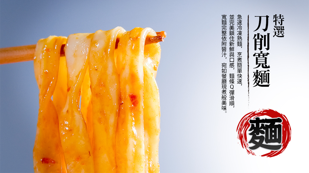 成分:牛肉料理包:水.牛腱(原產地:美國).牛筋(原產地:尼加拉瓜).醬油.辣豆瓣[台產紅辣椒.非基因改造黃豆.水.蠶豆.食鹽.蔗糖液糖.小磨香油(大豆油.芝麻).麵粉.調味劑(5'-次黃嘌呤核苷磷酸二鈉.5'-鳥嘌呤核苷磷酸二鈉).玉米糖膠.八角粉].紅酒.糖.牛油(原產地:澳洲).蔥.粘稠劑(乙醯化己二酸二澱粉).辣椒粉。 冷凍刀削麵:小麥粉、水、羥丙基磷酸二澱粉、鹽。