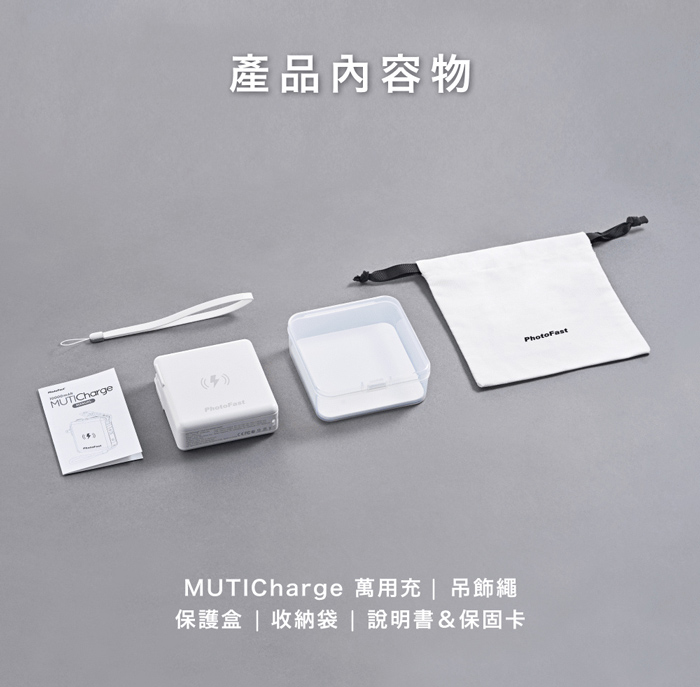 內容物:MUTICharge 萬用充|吊飾繩|保護盒|收納袋|說明書&保固卡
