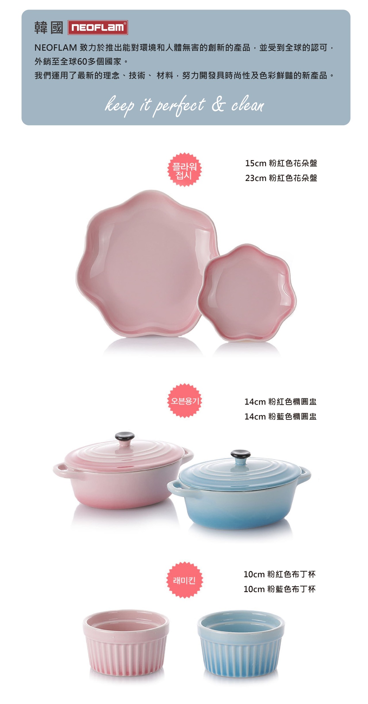 商品規格:15cm&23cm粉紅色花朵盤各*1 14cm粉紅色&粉藍色橢圓盅各*1 10cm粉紅色&粉藍色布丁杯各*1 共6件組