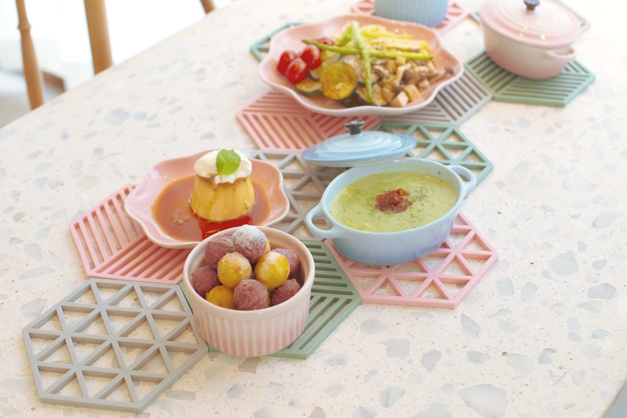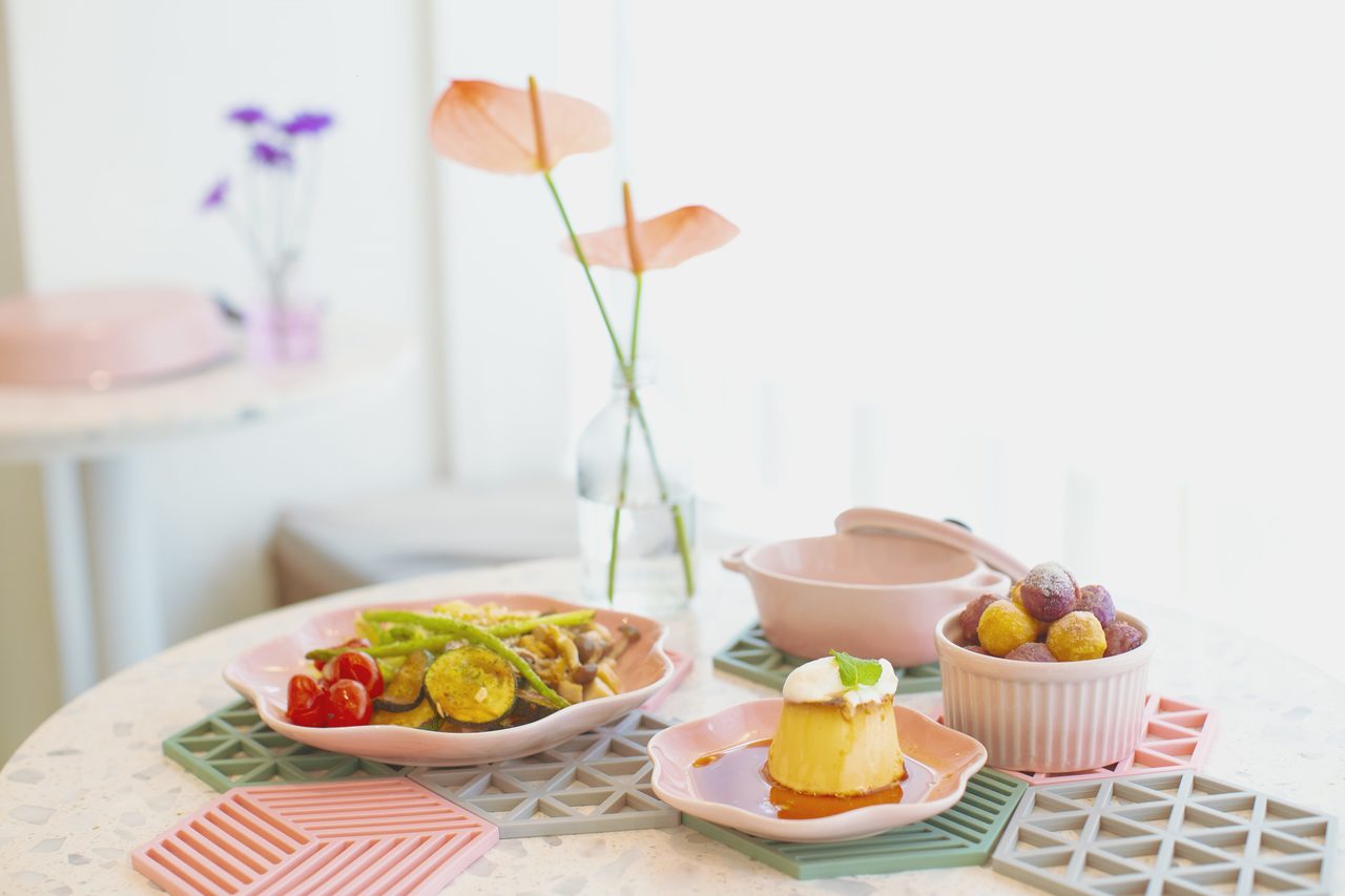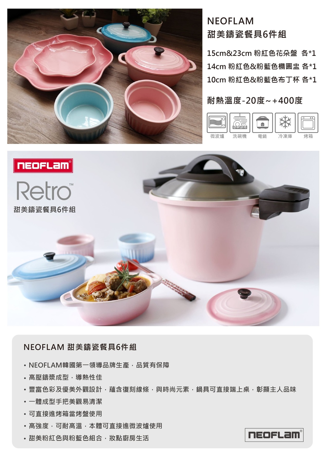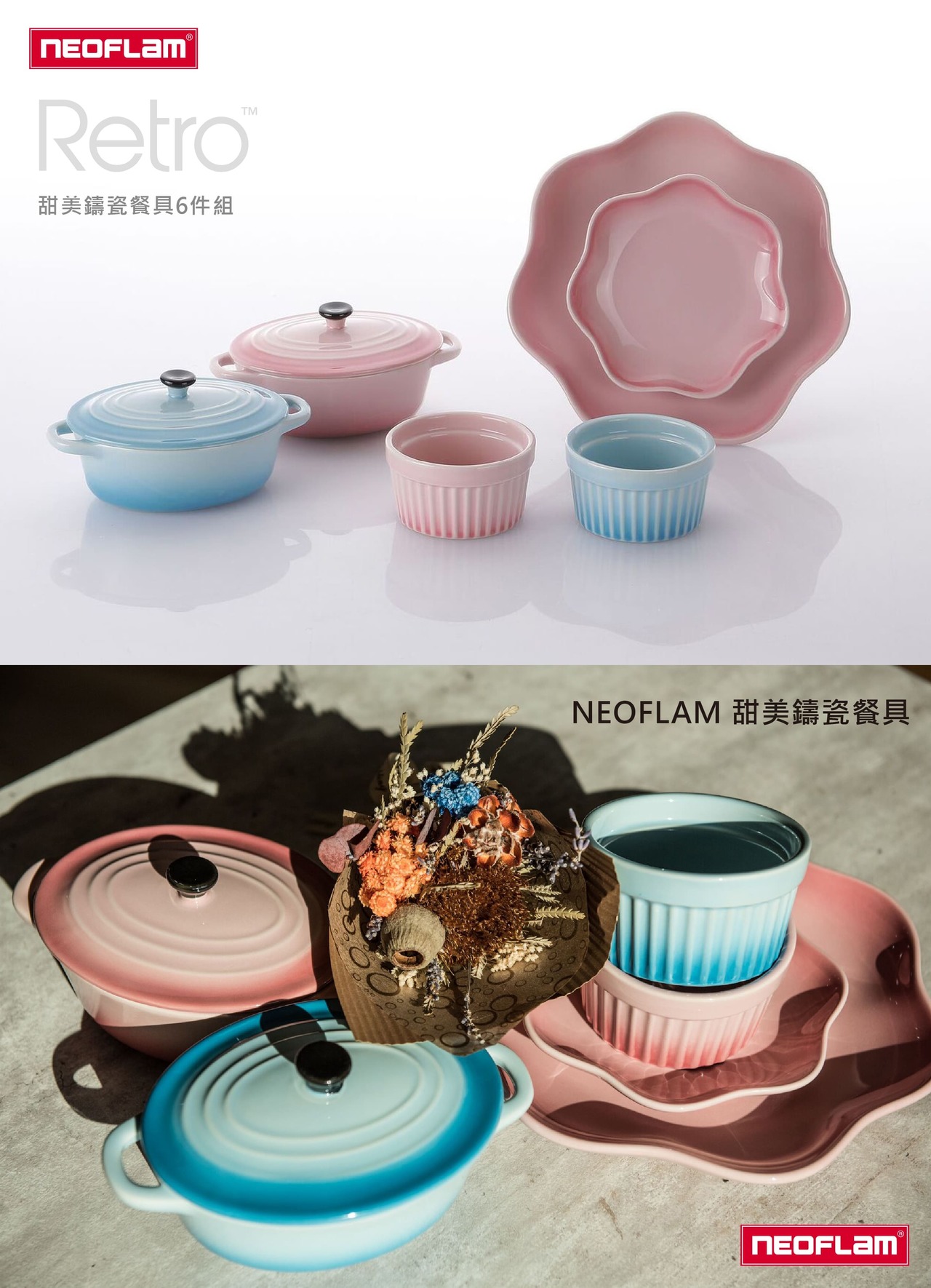內含:【NEOFLAM】甜美鑄瓷餐具6件組+【NEOFLAM】餐盤杯碗器皿防滑保護墊-幾何+線條 (粉紅/綠/灰) 6入組