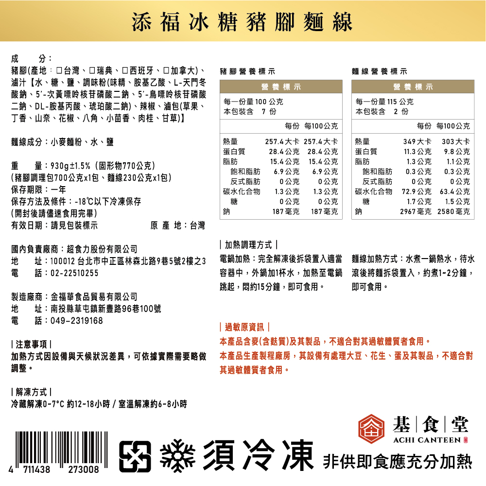 規格 : 930公克±2%、固形量770公克(豬腳調理包700公克x1,麵線230公克x1)