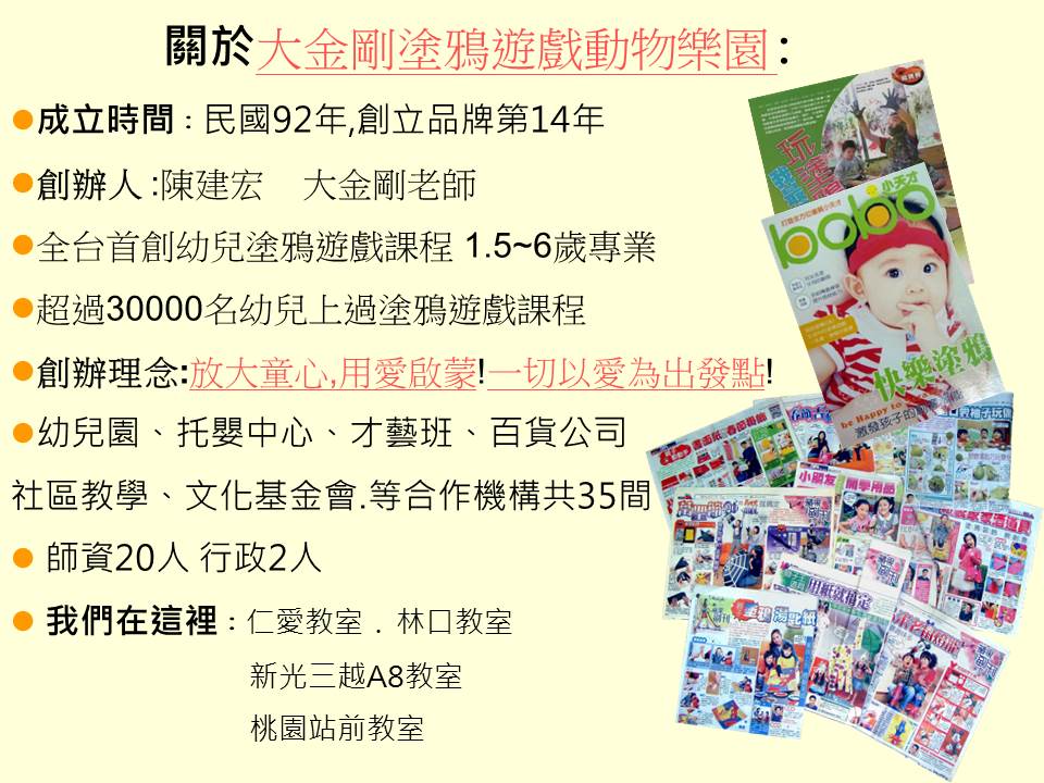 ◆仁愛教室:台北市中正區仁愛路二段98號5樓,TEL:02-2322-5757或私訊FB粉絲團『大金剛塗鴉遊戲動物樂園』