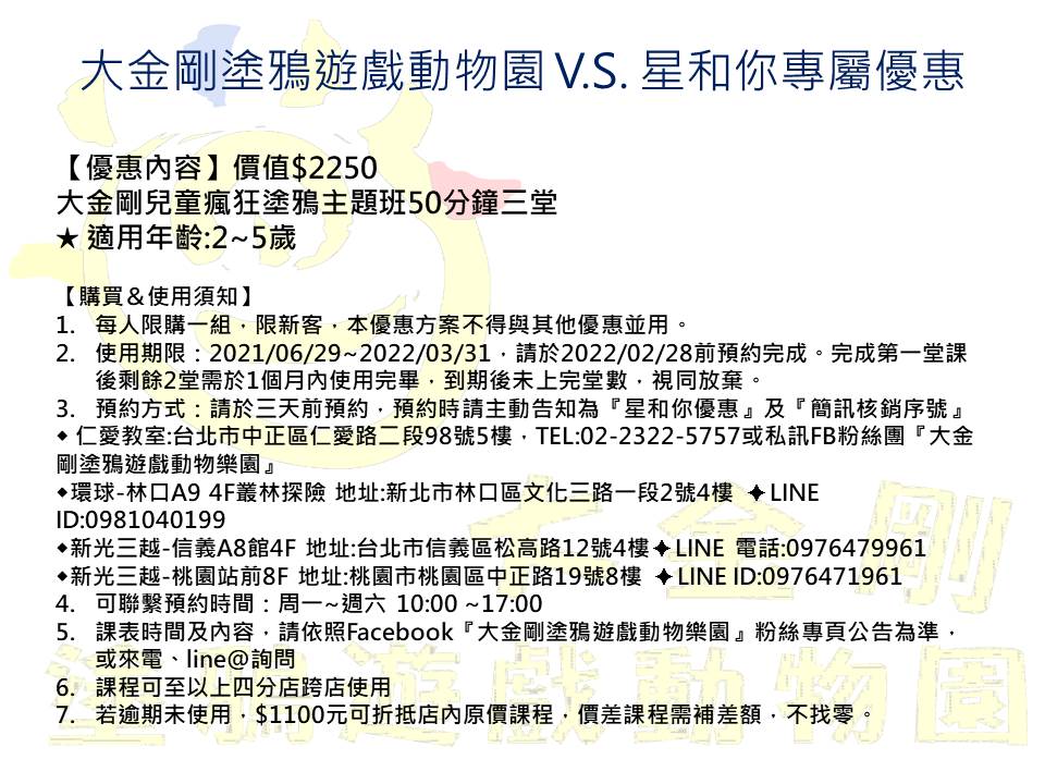 5.課表時間及內容,請依照Facebook『大金剛塗鴉遊戲動物樂園』粉絲專頁公告為準,或來電、line@詢問