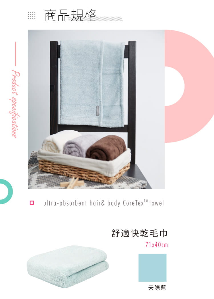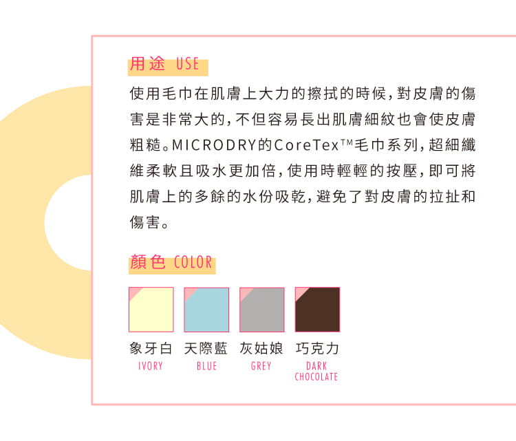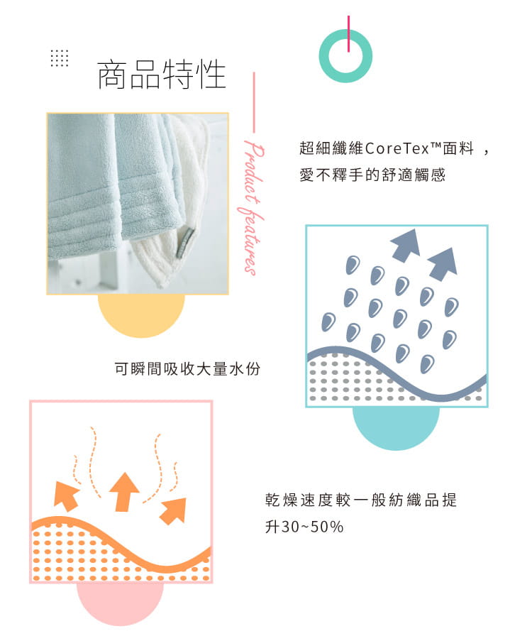 用途:超細纖維不傷臉部皮膚及髮質,迅速吸收洗髮後殘留的水份,無需反復擦拭,避免皮膚損傷和乾燥。