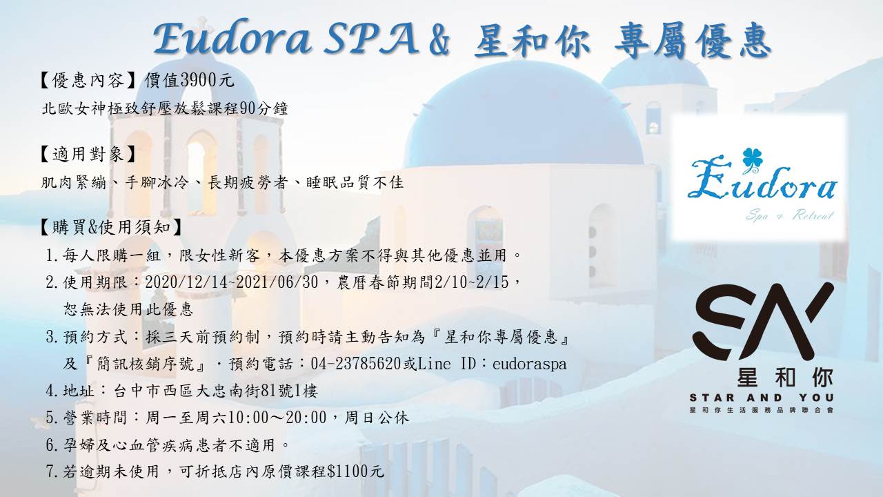 3. 預約方式: 採三天前預約制,預約時請主動告知為『星和你專屬優惠』及『簡訊核銷序號』,預約電話:04-23785620 或 LINE ID:eudoraspa