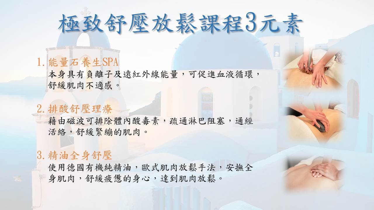 ★流程:能量石養生Spa 10分鐘→排酸紓壓20分鐘→精油全身舒壓60分鐘,共90分鐘