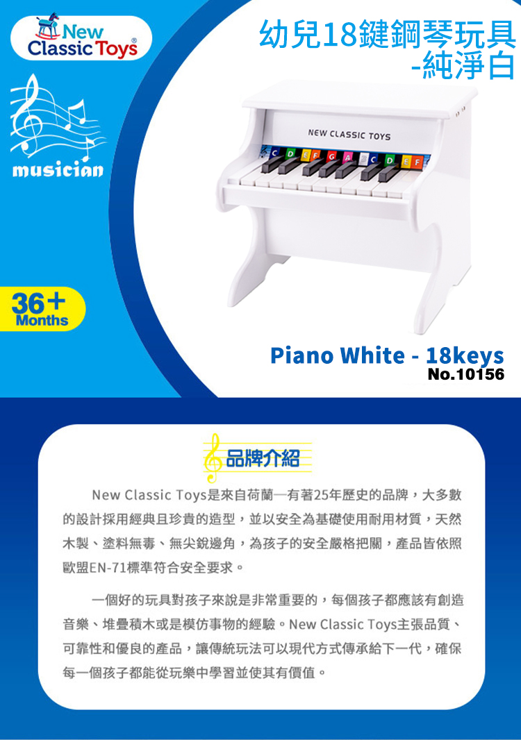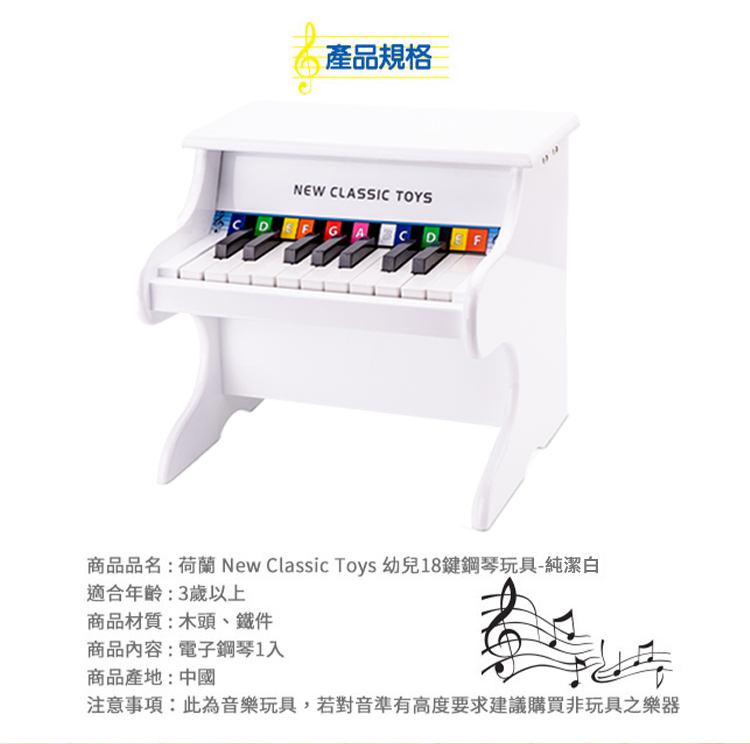 內含:【荷蘭New Classic Toys】幼兒18鍵鋼琴玩具-純淨白