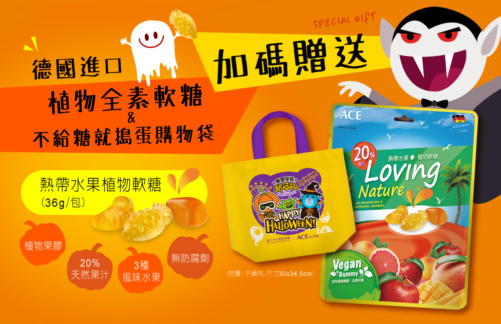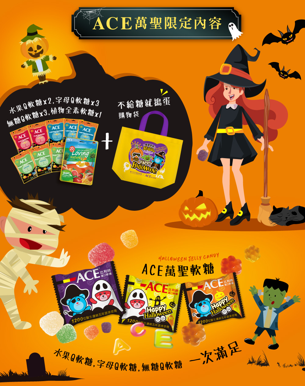 內含:水果48g*2+字母48g*3+無糖48g*3+植物軟糖36g*1+萬聖限定限量提袋*1