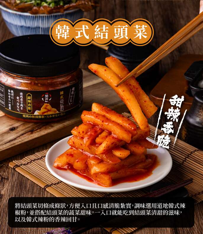 將結頭菜切條成條狀,方便入口且口感清脆紮實,調味選用道地韓式辣椒粉,並搭配結頭菜的蔬菜甜味,一入口就能吃到結頭菜清甜的滋味,以及韓式辣粉的香辣回甘。