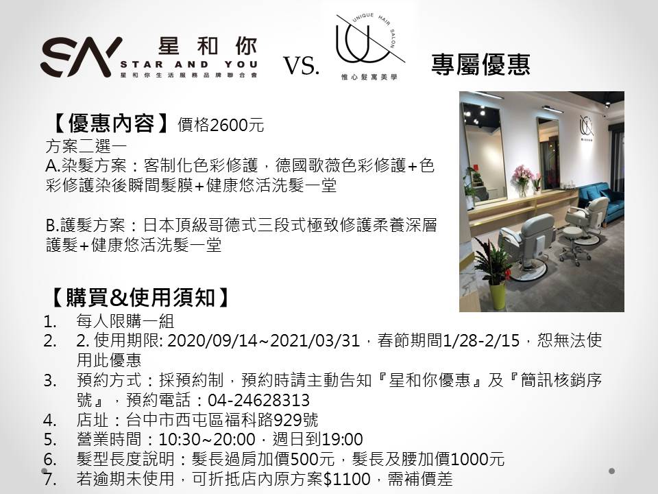 3 .預約方式:採預約制,預約時請主動告知『星和你優惠』及『簡訊核銷序號』,預約電話:04-24628313