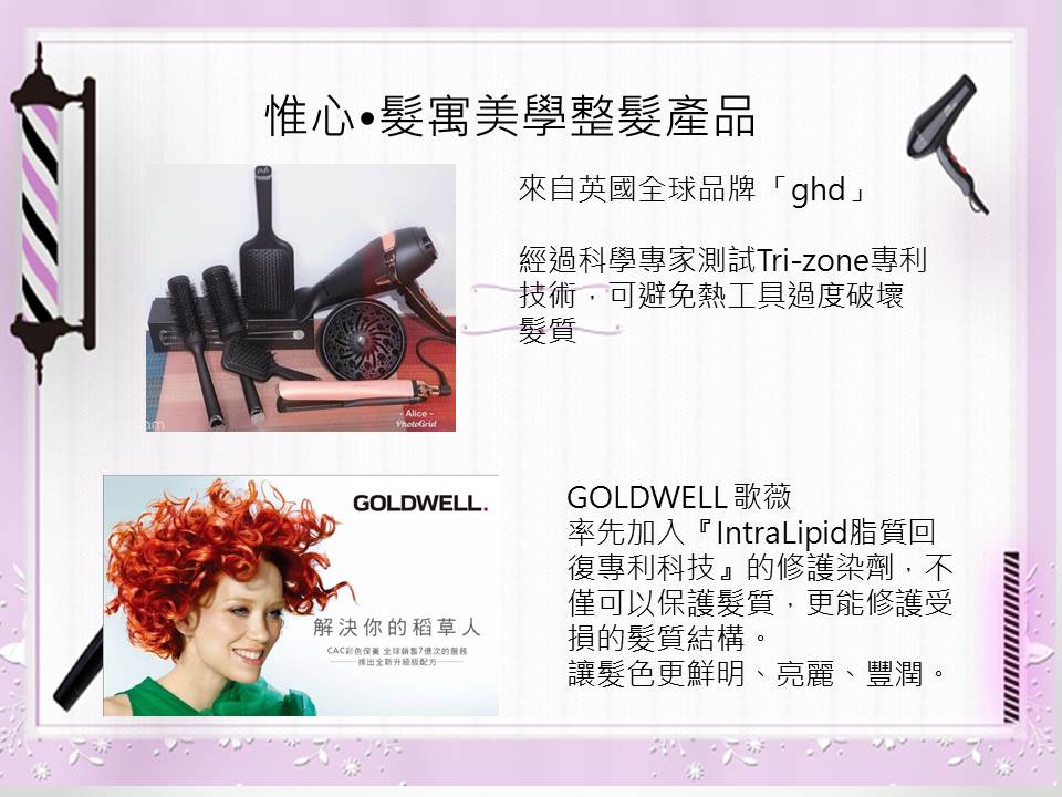 ★課程特色:針對染過顏色的頭髮,不僅可以保護髮質,更能修護受損髮質結構達到半永久式色彩填充,恢復韌度與光澤拋亮髮絲.