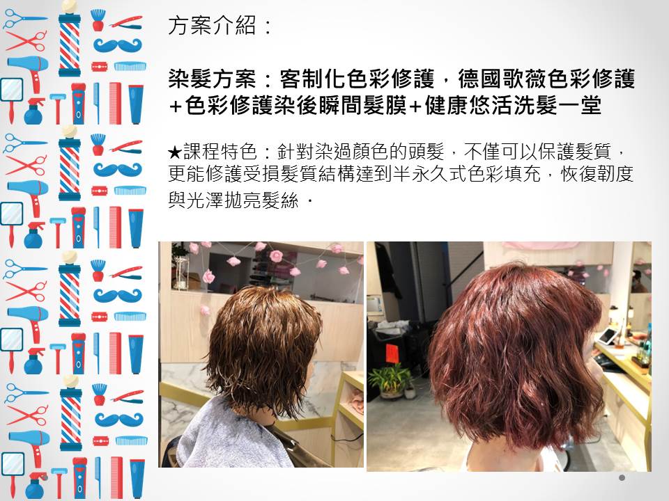 A.染髮方案:客制化色彩修護,德國歌薇色彩修護+色彩修護染後瞬間髮膜+健康悠活洗髮一堂