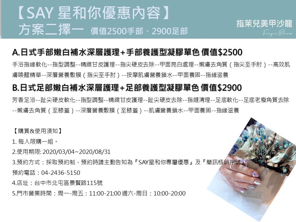 3.預約方式:採取預約制,預約時請主動告知為『SAY專屬優惠』及『簡訊核銷序號』。預約電話:04-2436-5150