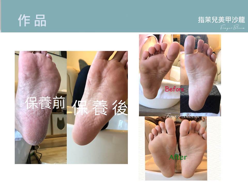 芳香足浴--趾尖硬皮軟化--指型調整--精緻甘皮護理--趾尖硬皮去除--指縫清理--足底軟化--足底老廢角質去除--嫩膚去角質(至膝蓋)--深層營養敷膜(至膝蓋)--肌膚營養鎖水--甲面養固--指緣滋養