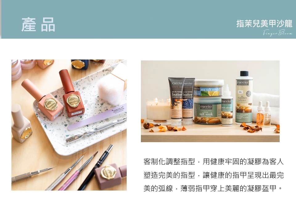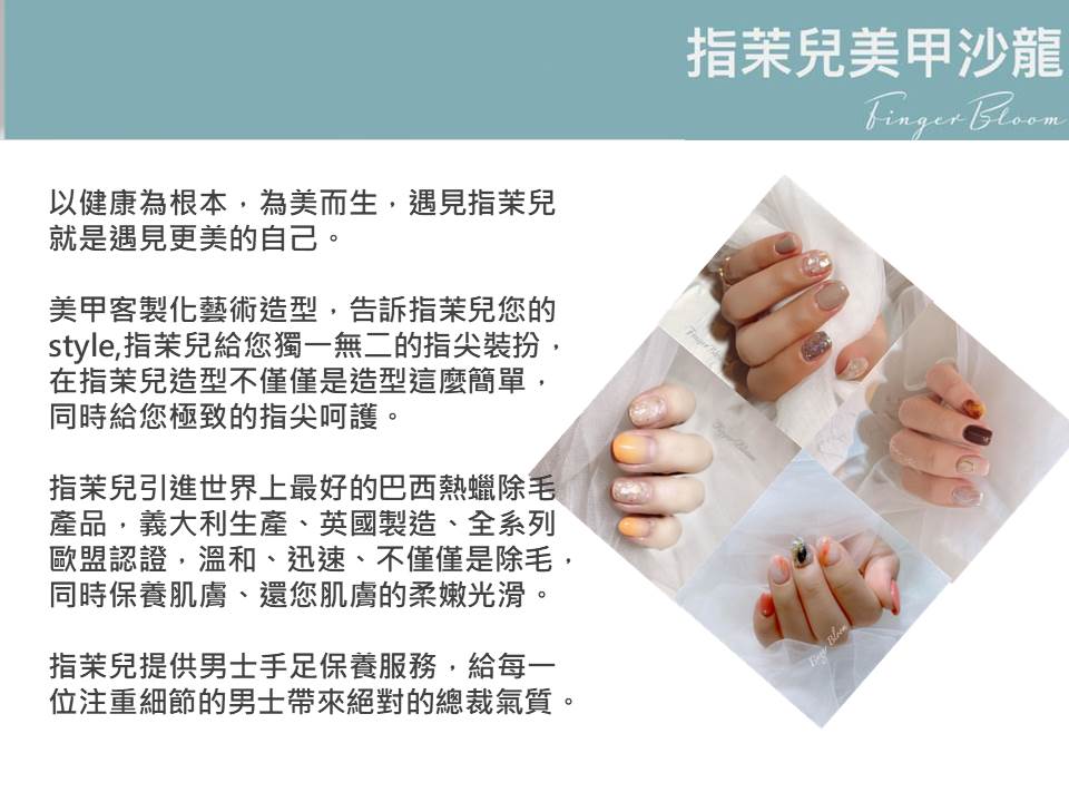 手浴指緣軟化--指型調整--精緻甘皮護理--指尖硬皮去除--甲面亮白處理--嫩膚去角質(指尖至手肘)--高效肌膚喚醒精華--深層營養敷膜(指尖至手肘)--按摩肌膚營養鎖水--甲面養固--指緣滋養